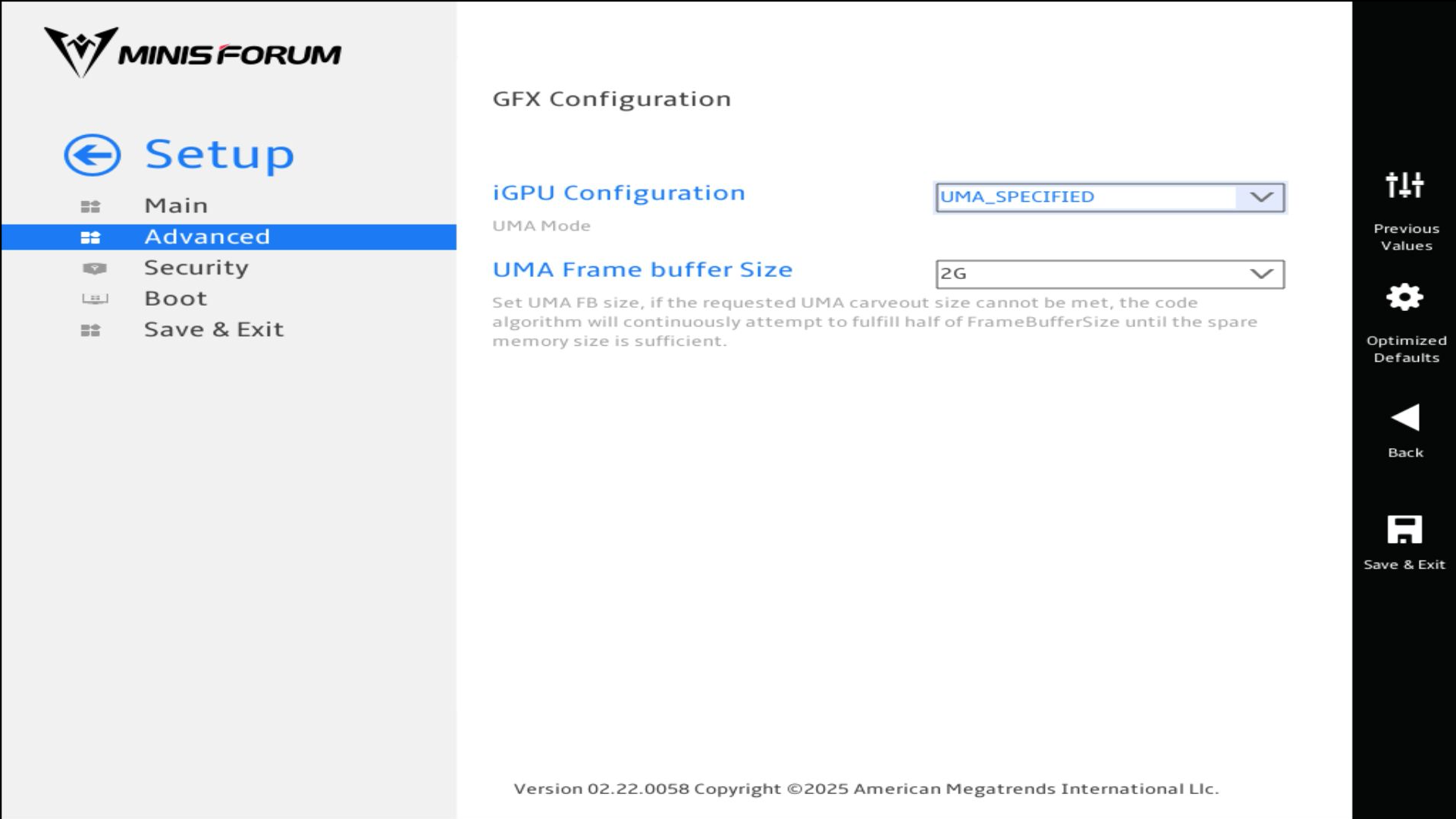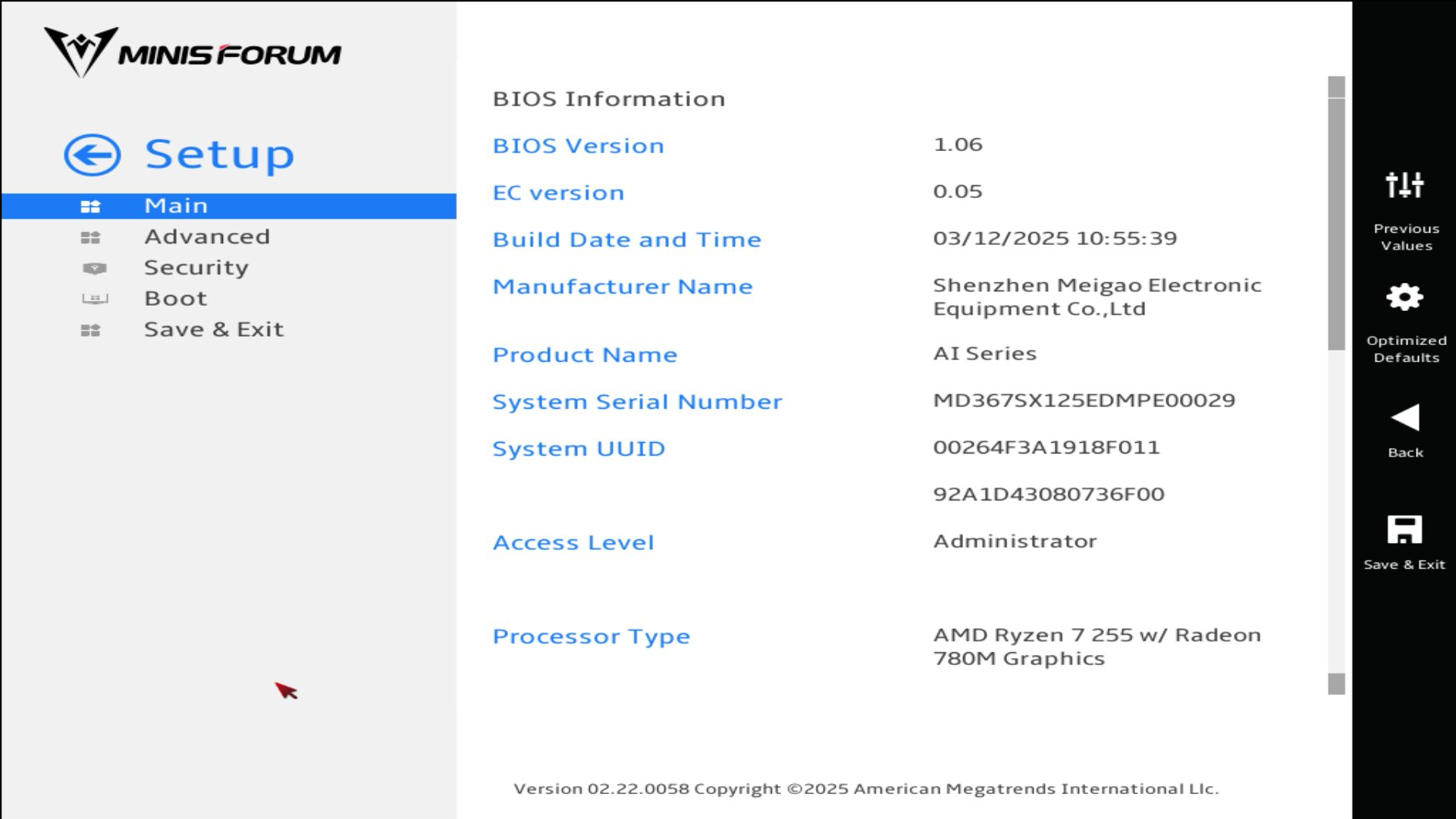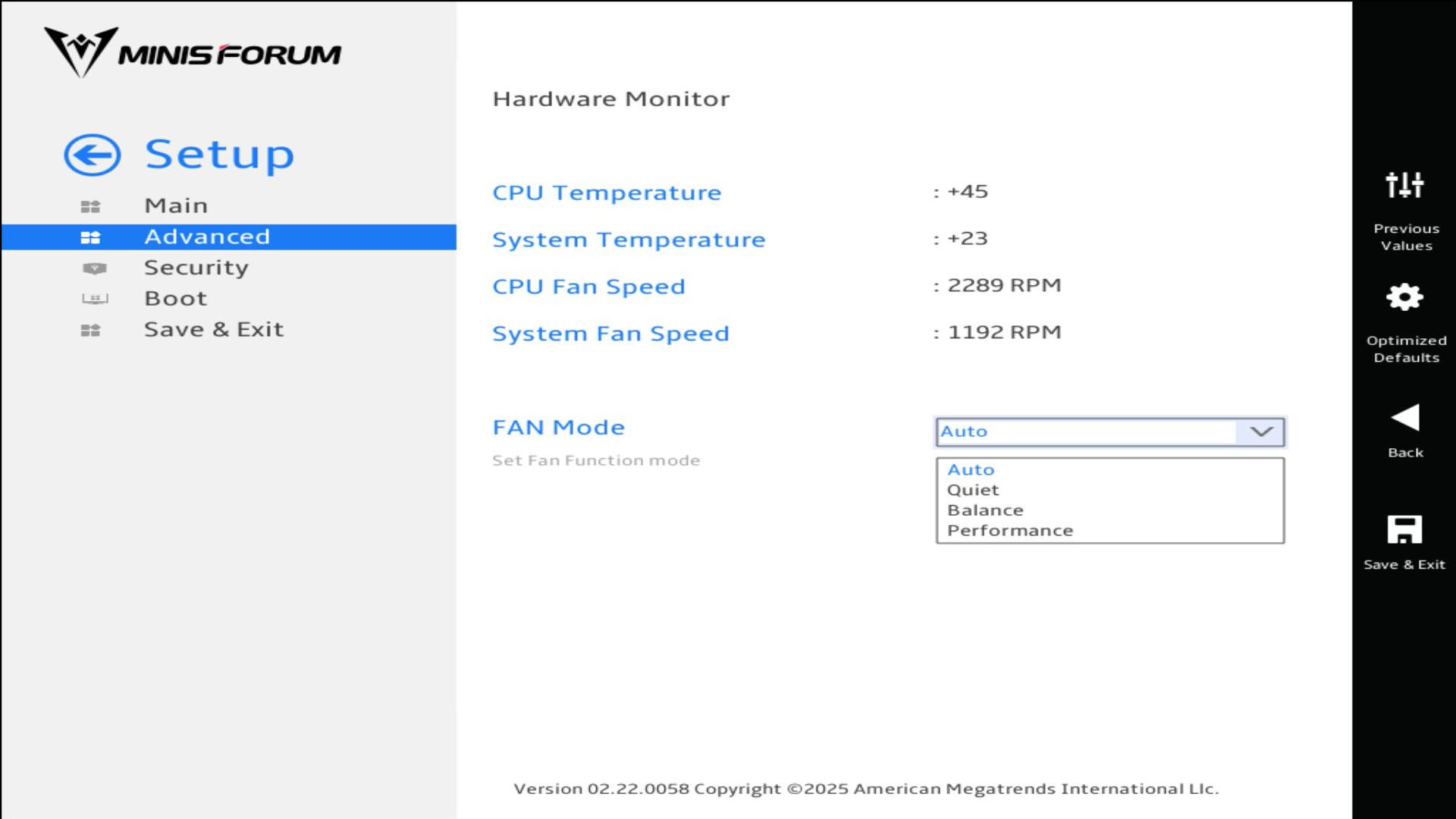 Wszystkie testy wydajności Minisforum AI X1 zostały przeprowadzone w ustawieniach fabrycznych. W UEFI, Minisforum umożliwia również dostosowanie zarówno profilu wydajności procesora, jak i sterowania wentylatorem.
