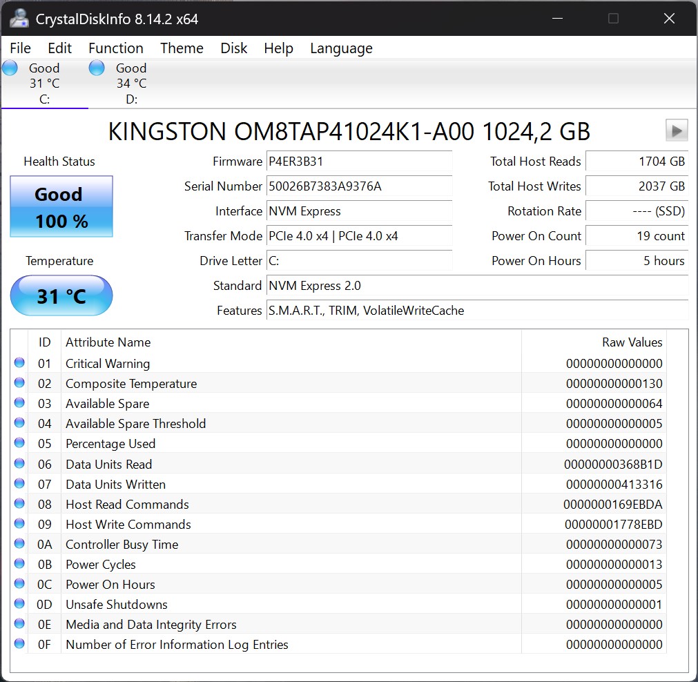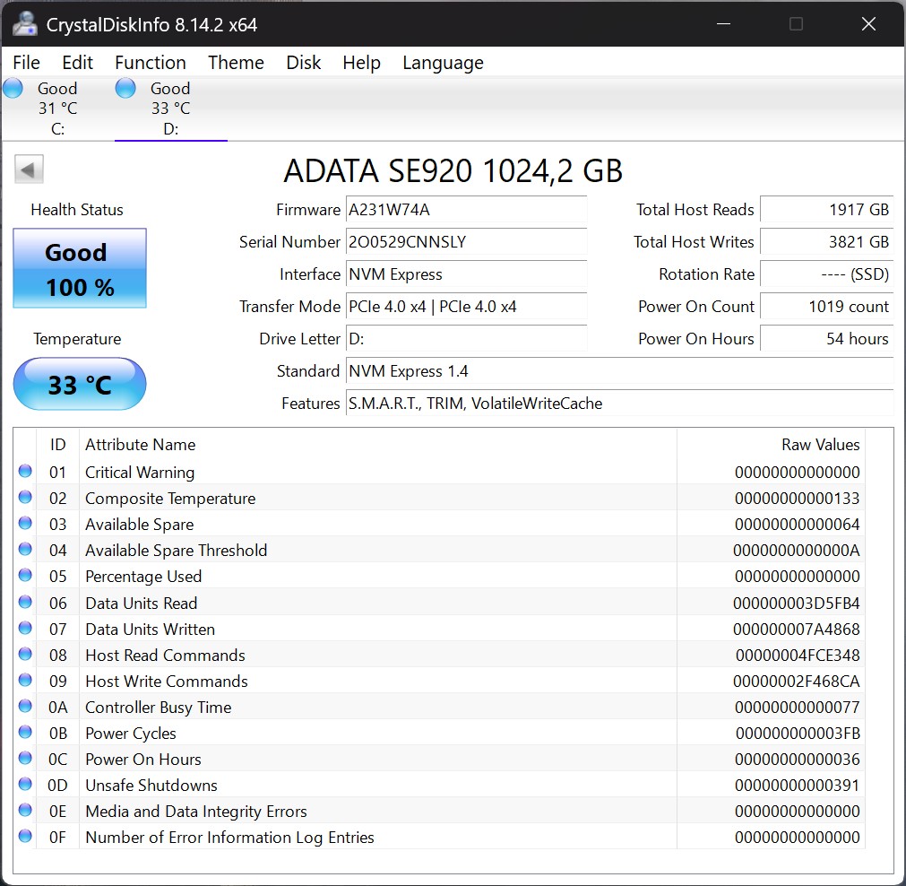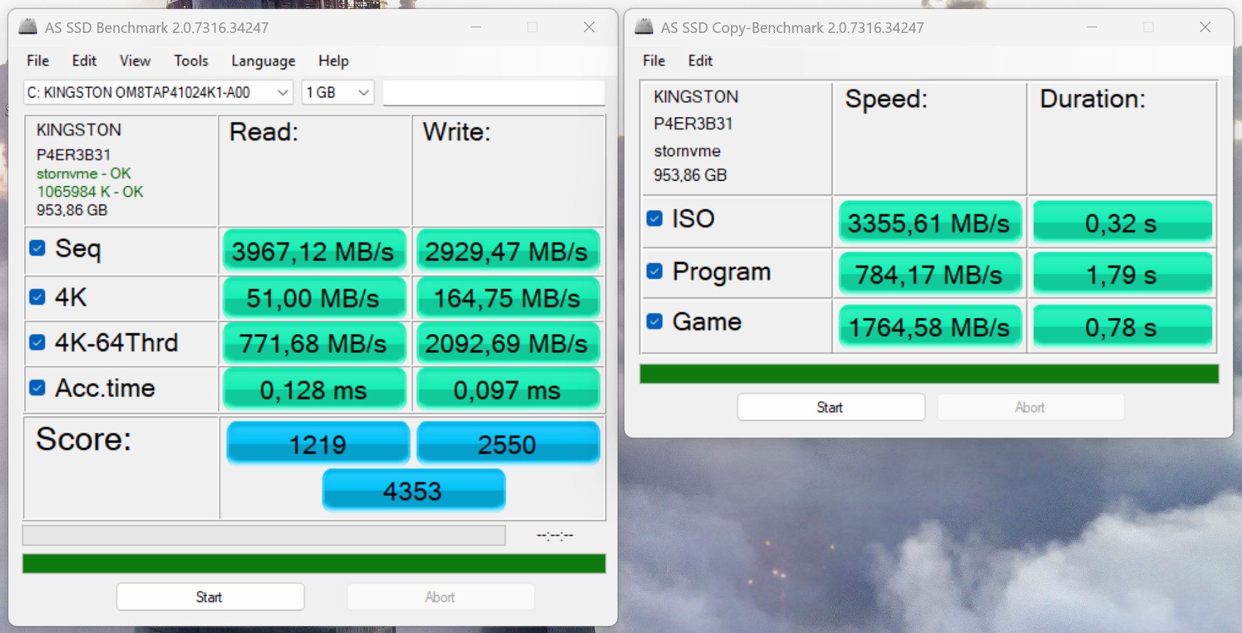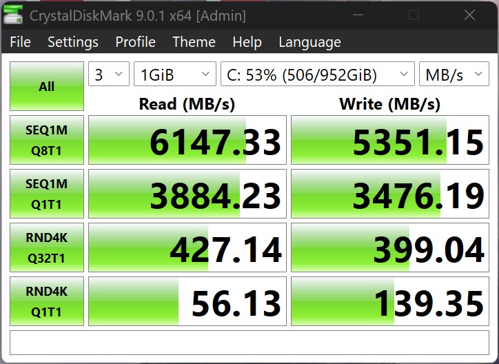 Minisforum AI X1 wykorzystuje dysk SSD o pojemności 1 TB firmy Kingston ze złączem PCIe 4.0 x4, które oferuje niezawodne, choć nie wybitne, prędkości transferu. Aktywne chłodzenie zapewnia również stale stabilną wydajność i zapobiega spadkom podczas długotrwałego obciążenia. Dla pamięci masowej dostępne są dwa gniazda M.2, ale gdy używany jest adapter OCuLink, tylko jedno z nich może być zajęte.