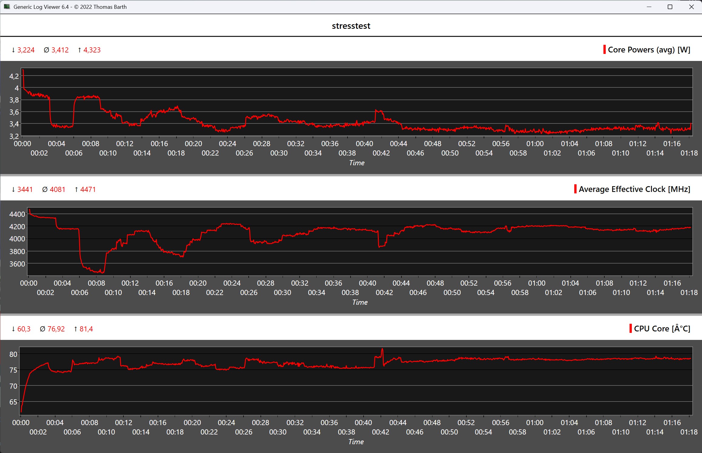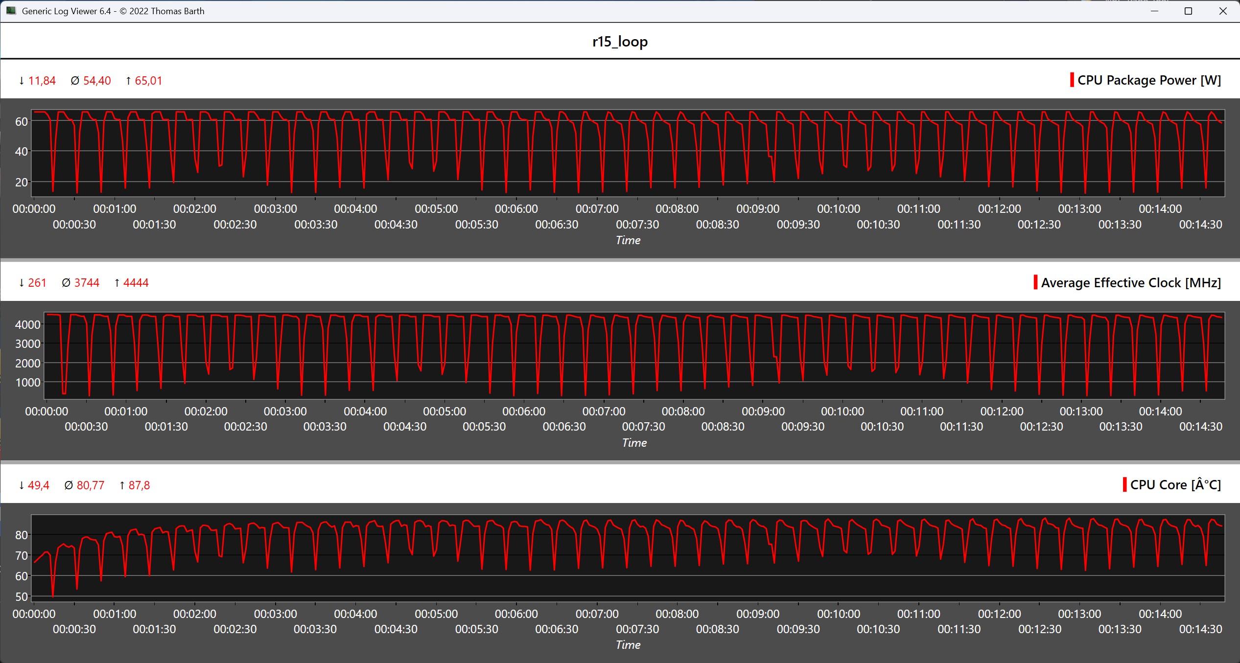 W pierwszym dłuższym teście obciążeniowym z ciągłą pętlą Cinebench R15, Minisforum AI X1 pokazuje, że AMD Ryzen 7 255 nie cierpi na żaden znaczący spadek wydajności nawet w dłuższych okresach czasu. Analiza danych telemetrycznych dowodzi, że SoC może pracować z mocą do 54 W pod ciągłym obciążeniem. Temperatura Ryzena 7 255 stabilizuje się na poziomie około 88 C.