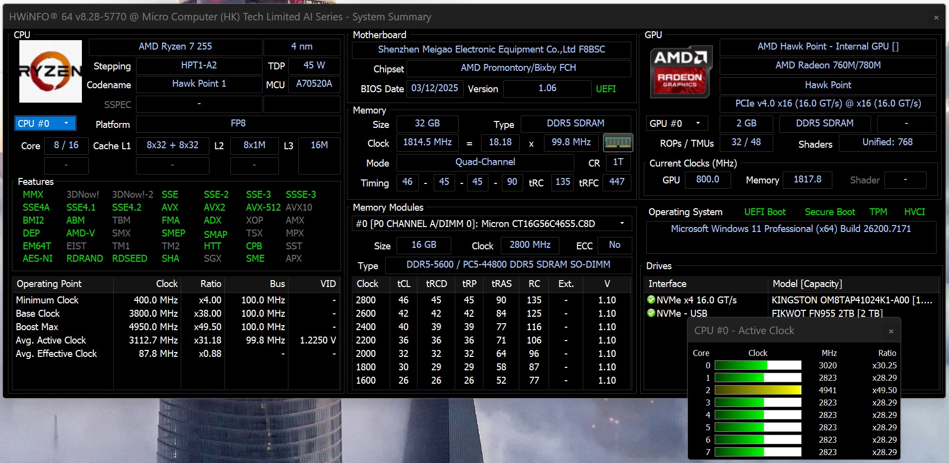 AMD Ryzen 7 255 AMD Ryzen 7 255 w Minisforum AI X1 zapewnia solidną wydajność jedno- i wielordzeniową dzięki nowoczesnej architekturze. W bezpośrednim porównaniu wydajność jest na oczekiwanym poziomie innych 8-rdzeniowych procesorów, bez żadnych rozpoznawalnych sztucznych ograniczeń wydajności przez producenta. SoC może również osiągnąć krótkoterminowy pobór mocy do 65 watów.