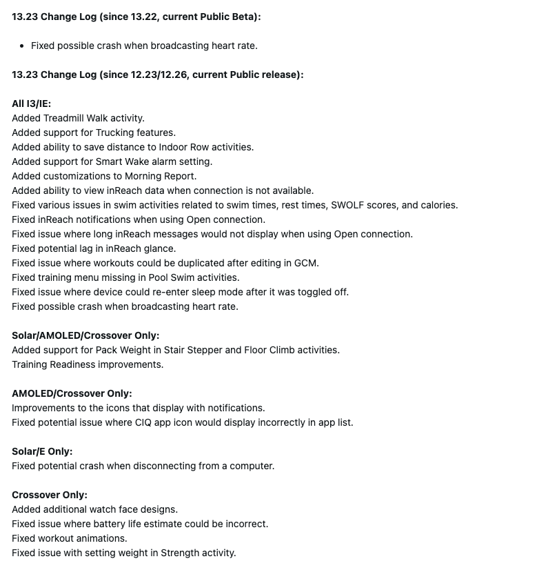 Wersja beta oprogramowania 13.23 została udostępniona bezprzewodowo smartwatchom Instinct 3, Instinct E i Instinct Crossover. Zgodnie z ostatnim postem na forum Garmin https://forums.garmin.com/beta-program/instinct-3/f/announcements/430973/beta-version-13-23--available-otazostała ona udostępniona wszystkim użytkownikom i powinna zostać odebrana podczas następnego połączenia z aplikacją Garmin Connect Manager na smartfona przez Bluetooth lub Garmin Express na komputerze.