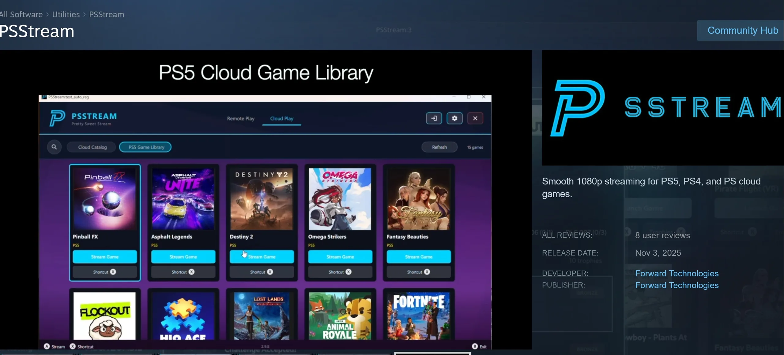 Jak pokazano w filmie wideo od twórcy, PSStream ma zakładki do gry zdalnej i gry w chmurze. W sekcji Cloud Play gracze mogą przeglądać katalog tytułów opartych na subskrypcji. Menu biblioteki gier PS5 jest bardziej intrygujące, ponieważ pokazuje inne kompatybilne opcje, które użytkownicy już zakupili.