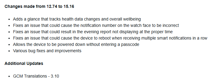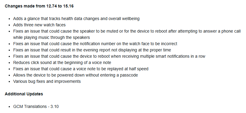 Dziennik zmian wersji 15.16 podaje, że głośność dźwięku kliknięcia odtwarzanego podczas rozpoczynania notatki głosowej została zmniejszona. Garmin naprawił problem, który mógł powodować nieprawidłowe wyciszenie głośnika podczas próby odebrania połączenia telefonicznego. Rozwiązano również problemy związane z numerem powiadomienia wyświetlanym na tarczy zegarka i nieprawidłową godziną wyświetlaną w raporcie wieczornym. Co więcej, aplikacja Garmin Connect Mobile Translations została zaktualizowana do wersji 3.10, choć nie jest jasne, jakie korzyści przyniesie to użytkownikom.