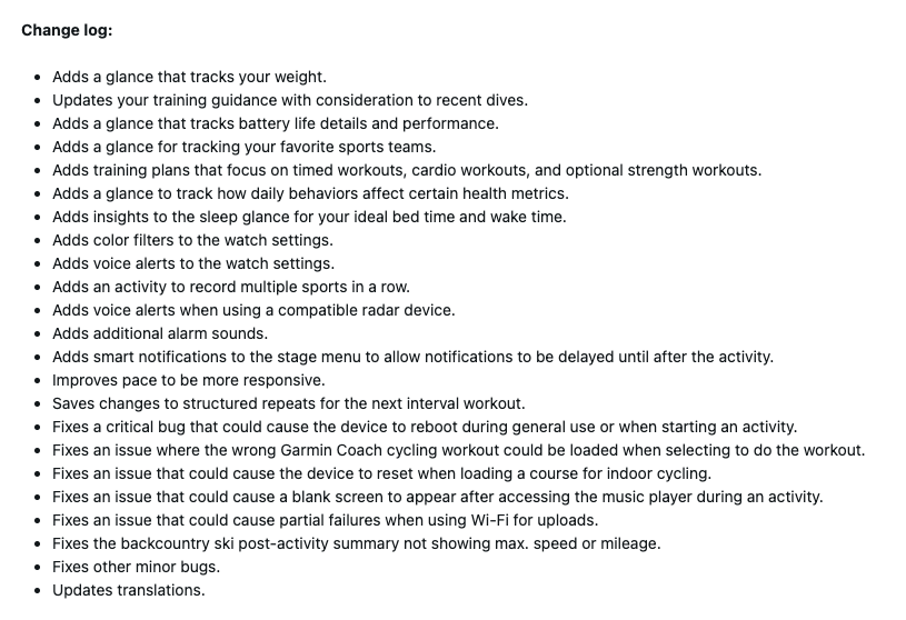 Chociaż dziennik zmian (zrzut ekranu poniżej) zawiera wiele zmian, niektóre z nich zostały uwzględnione w starszych wersjach. Nowością w wersji beta 16.28 jest więcej dźwięków alarmów i możliwość opóźnienia powiadomień do czasu po zakończeniu aktywności, dzięki dodaniu ich do menu etapów. Ponadto, aplikacja Garmin Connect Mobile Translations została zaktualizowana do wersji 3.50.