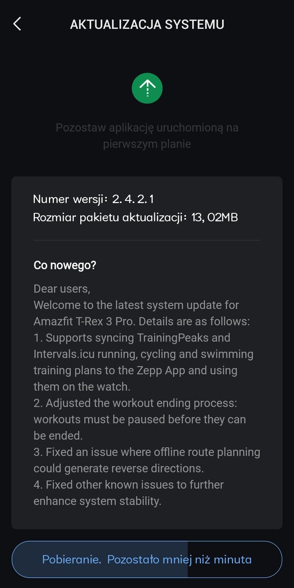 Wersja oprogramowania 2.4.2.1 została zgłoszona przez użytkowników T-Rex 3 Pro na Reddit. W udostępnionym dzienniku zmian (poniżej) czytamy, że wersja ta wprowadza ulepszoną integrację z TrainingPeaks i Intervals.icu. Można teraz synchronizować plany treningowe biegania, jazdy na rowerze i pływania z aplikacją Zepp, które są również dostępne na smartwatchu. Jest jeszcze jedna zmiana związana z treningiem, która oznacza, że użytkownicy muszą teraz wstrzymać trening przed jego zakończeniem.