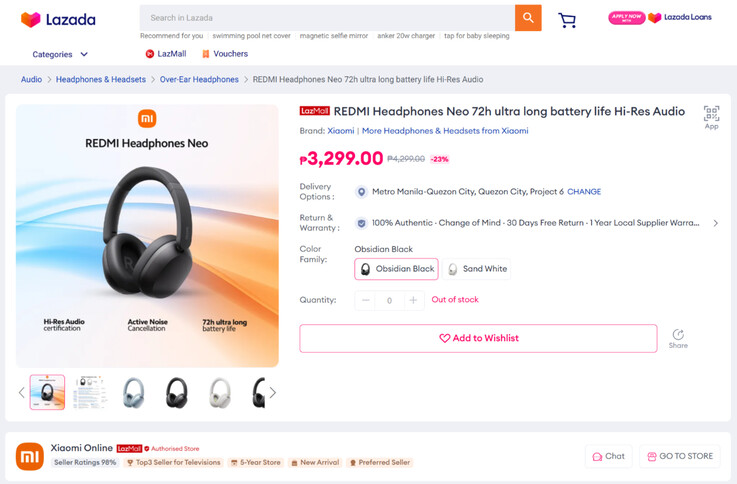 Xiaomi początkowo wypuści Redmi Headphones Neo w kolorach Obsidian Black i Sand White. Jak pokazują poniższe zdjęcia, Lazada wyceniła Redmi Headphones Neo na 3,299 PHP (~ 55 USD) na Filipinach, po obniżce z 4,299 PHP (~ 70 USD). Tymczasem Diglex Electronics wystawił te same słuchawki za 36,70 USD, ale przy minimalnej ilości zamówienia wynoszącej 100 sztuk.