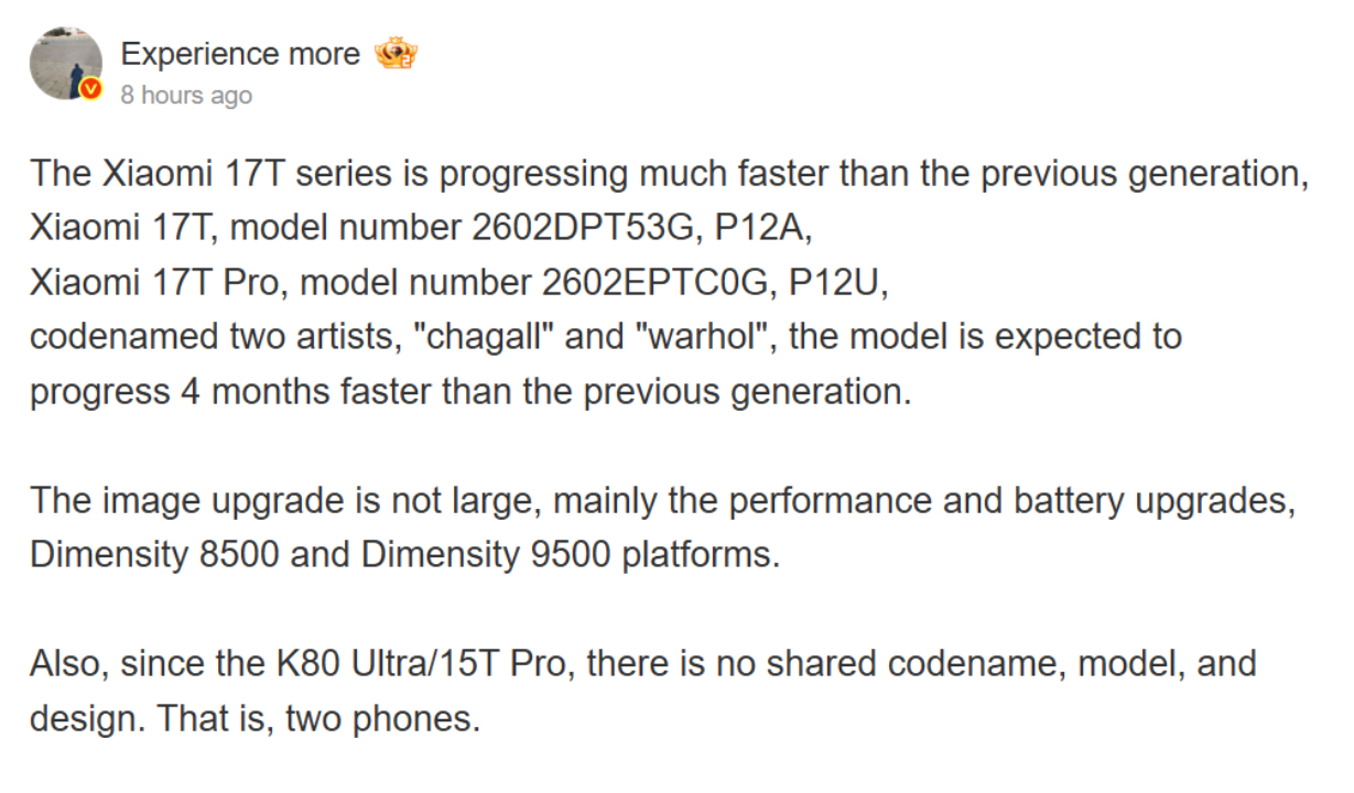 Zamiast tego twierdzą, że Xiaomi 17T Pro i Redmi K90 Ultra to dwa różne smartfony. Pisząc na Weibo, Experience more spodziewa się, że zarówno Xiaomi 17T Pro, jak i Xiaomi 17T są "cztery miesiące przed poprzednią generacją". W związku z tym możemy zobaczyć, jak seria Xiaomi 17T zadebiutuje na całym świecie w połowie lub pod koniec maja 2026 roku, a nie we wrześniu 2026 roku.