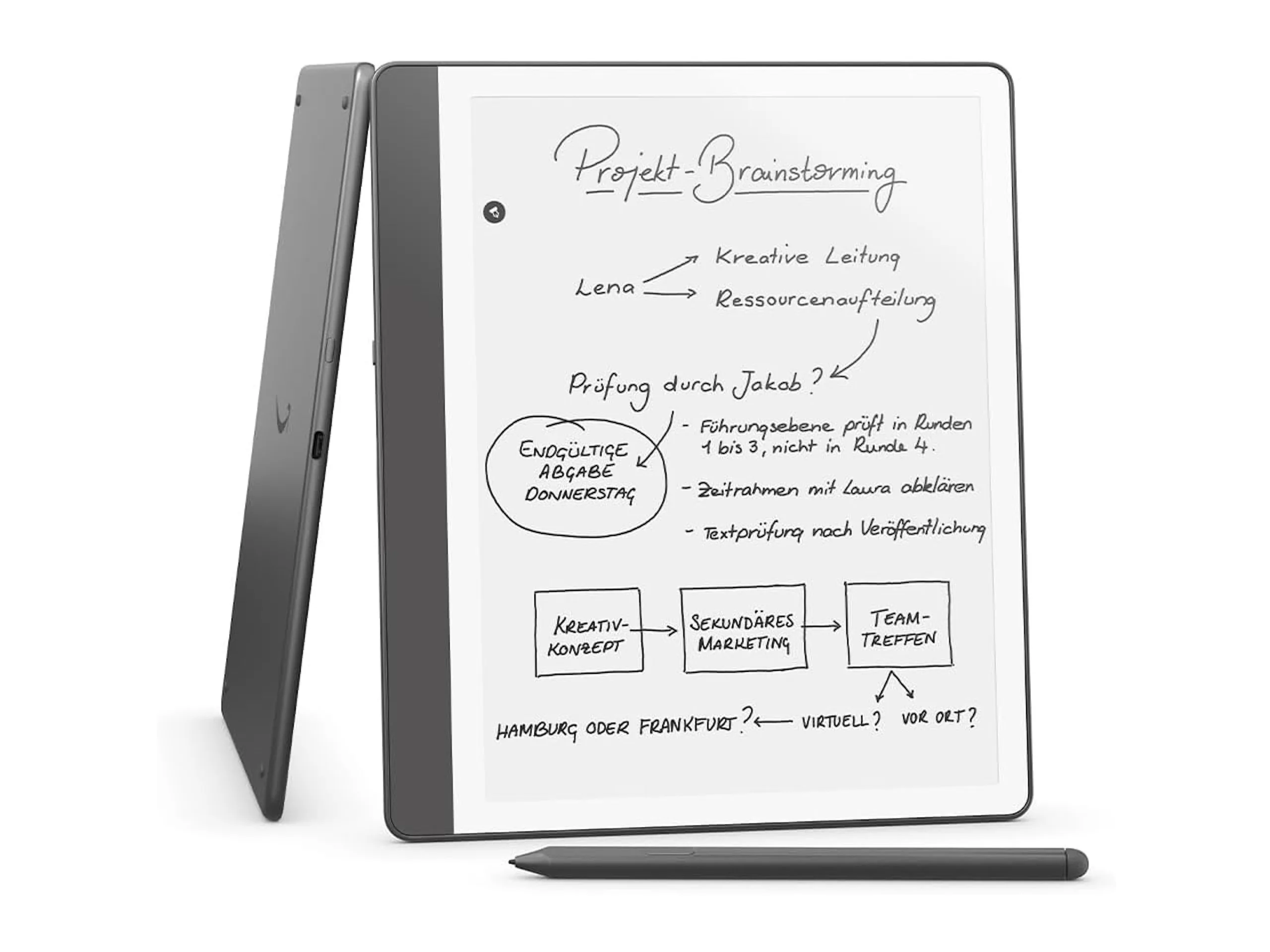 E-book o wymiarach 196 x 230 milimetrów jest wyposażony w ekran o przekątnej 10,2 cala i gęstości pikseli 300 PPI. Nie można wyświetlać żadnych kolorowych treści, więc wyświetlacz jest ograniczony do 16 odcieni szarości i nie nadaje się szczególnie do komiksów. Jak wspomniano powyżej, obsługiwane jest wprowadzanie danych rysikiem, co z pewnością nie jest oczywiste w czytnikach e-booków. Pozwala to użytkownikom na robienie notatek lub tworzenie rysunków, na przykład z wyczuciem pisania na papierze. Rysik jest wyposażony w definiowany przez użytkownika przycisk skrótu i nie wymaga specjalnej konfiguracji ani ładowania.