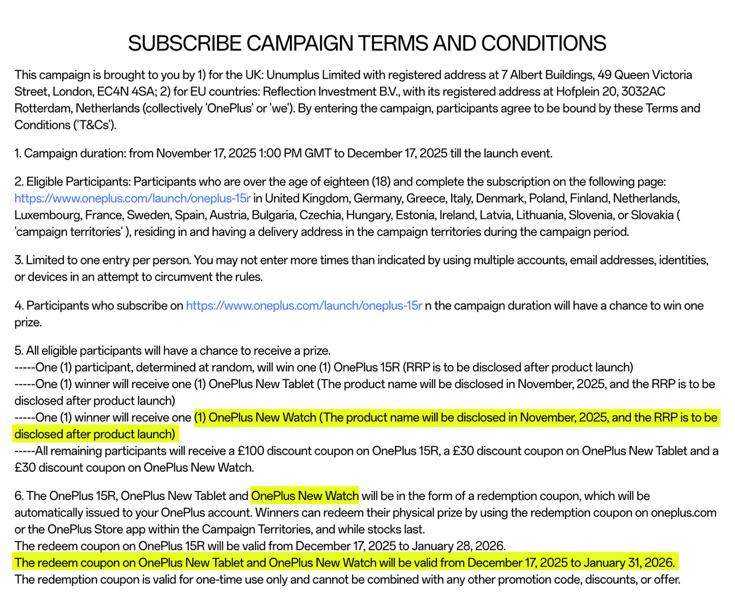 Oprócz tych urządzeń, OnePlus przygotowuje się do wypuszczenia nowego smartwatcha w okresie świątecznym. Obecnie firma potwierdziła jedynie, że "OnePlus New Watch" "pojawi się wkrótce". Podczas gdy nazwa urządzenia pozostaje na razie nieznana, warunki najnowszej kampanii startowej firmy potwierdzają, że ujawni ona nazwę produktu OnePlus New Watch jeszcze w tym miesiącu.