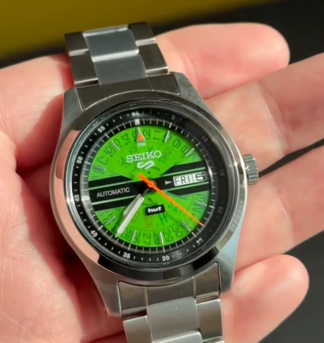 Nowo zauważone praktyczne zdjęcia, dzięki @SeikoLeaks na YouTubedają nam praktyczne spojrzenie na to, jak tarcza z octanu "HUF Green" wchodzi w interakcję ze światłem. Zgodnie z oczekiwaniami, istnieje wysoki stopień przejrzystości, który odsłania mechaniczne koła dnia i daty pod powierzchnią. Wykonanie tarczy, inspirowane "Time Sonar" z lat 70-tych, tworzy warstwowy, trójwymiarowy efekt, który zwykle nie jest widoczny w podstawowej linii Seiko 5. Podczas gdy rendery promocyjne często oczyszczają te tekstury, fizyczne ujęcia ujawniają unikalny industrialny charakter, z czarnym poziomym paskiem "Automatic" i logo "huf" na godzinie 6, które wydają się unosić nad zieloną tarczą.