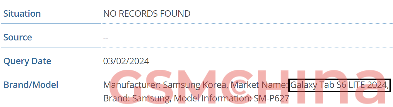 Z drugiej strony, GSMChina podzielił się dowodami numerów modeli SM-P625 i SM-P627 powiązanych z nazwą detaliczną "Galaxy Tab S6 LITE 2024", prawdopodobnie stylizowaną na Galaxy Tab S6 Lite (2024). Biorąc pod uwagę te numery modeli w bazach danych IMEI, powinno wynikać, że oba dotyczą SKU LTE, a GSMChina dodaje, że SM-P627 to turecki wariant regionalny. W związku z tym SM-P620 powinien odnosić się do wersji Wi-Fi Galaxy Tab S6 Lite (2024), którą Samsung będzie sprzedawał na całym świecie.