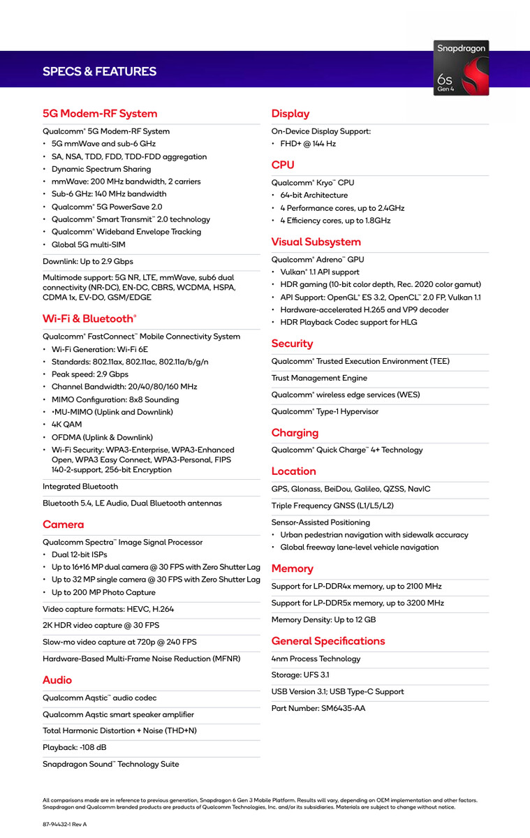 W rzeczywistości Snapdragon 6s Gen 4 oferuje ten sam układ procesora i prędkości zegara co Snapdragon 6 Gen 3. Mając to na uwadze, ten pierwszy przeskakuje do 144 Hz i obsługi wyświetlacza 1080p, z oferowaną również łącznością Bluetooth 5.4. Proszę zapoznać się z poniższym opisem produktu Qualcomm, aby uzyskać więcej szczegółów.