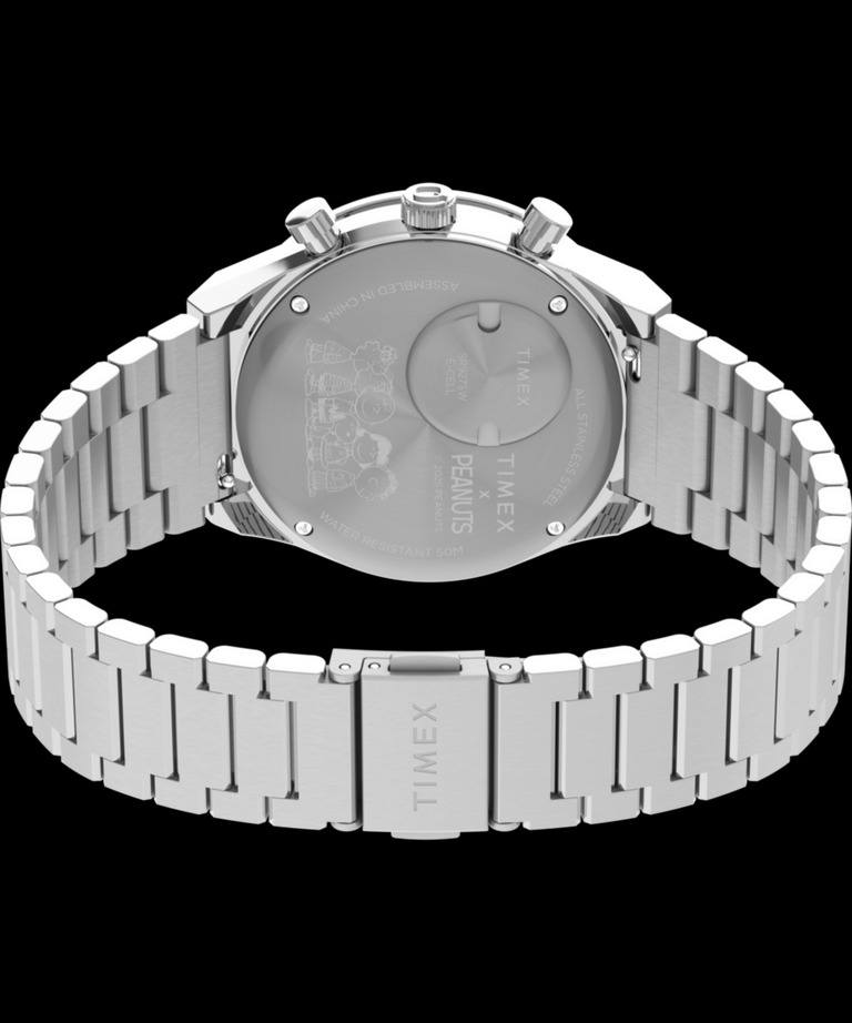 Stalowa bransoleta zapinana jest bez użycia narzędzi na składane zapięcie. Wodoodporność wynosi 50 metrów, co wystarcza do lekkiego pływania. Na deklu widnieje logo marki Peanuts, a zdjęcia produktu przedstawiają szczotkowane wykończenie wzdłuż górnych powierzchni z polerowanymi krawędziami.