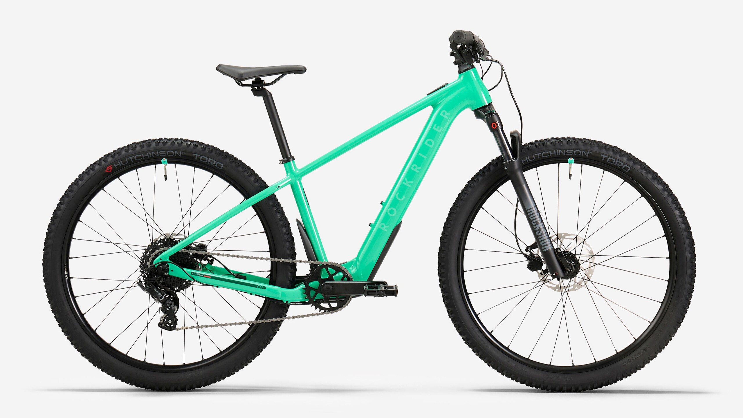 Ten model Rockrider ma widelec amortyzowany RockShox Judy o skoku 80 mm i opony Hutchinson Toro 26 x 2,15 cala, aby jazda była bardziej komfortowa. Ponadto ten 9-biegowy e-rower jest wyposażony w hydrauliczne hamulce tarczowe zapewniające krótszą drogę hamowania. Ma jasnozieloną aluminiową ramę, a cały rower waży około 16 kg (~ 35 funtów).