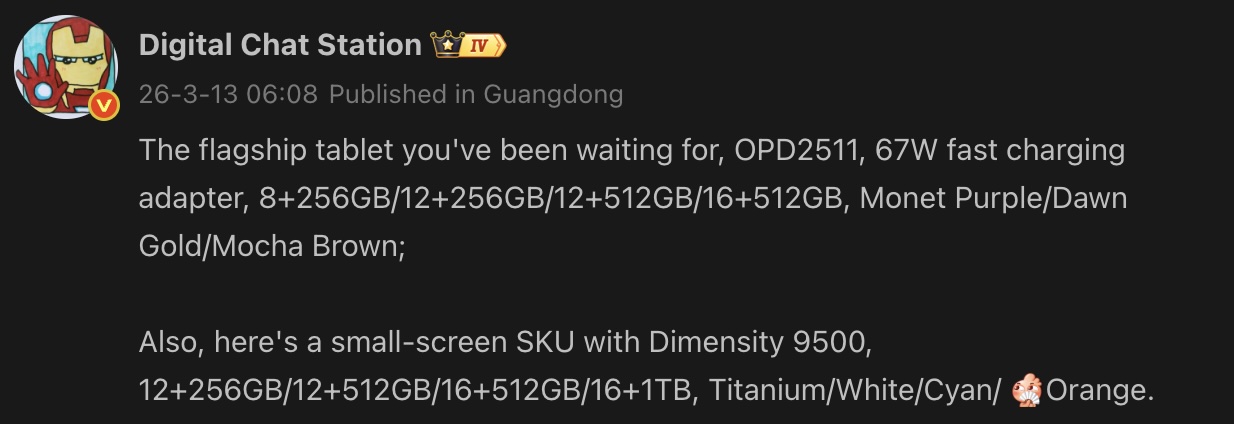 Jednym z nich jest tablet który nosi numer modelu "OPD2511" Przeciek nie ujawnia jednak dokładnej nazwy urządzenia. Informator ujawnił, że będzie on dostępny w czterech konfiguracjach pamięci: 8GB/256GB, 12GB/256GB, 12GB/512GB i 16GB/512GB. Nadchodzący flagowy tablet Oppo ma być dostępny w kolorach Monet Purple, Dawn Gold i Mocha Brown. Przeciek wskazuje również na obsługę szybkiego ładowania 67W.