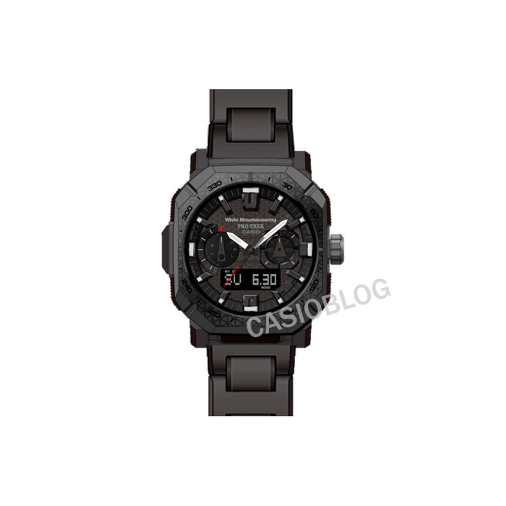 Model PRW-B1000WM-1 został ujawniony za pośrednictwem kanałów innych firm Casio w lutym 2026 roku, jako druga współpraca między Casio a japońską marką modową White Mountaineering, po podstawowym poziomie PRJ-B001WM. Ta nowa iteracja wykorzystuje wysokiej klasy obudowę PRW-B1000. Stalowy bezel ma charakterystyczny trójkątny wzór - charakterystyczny element marki - i jest prawdopodobnie chroniony powłoką jonową (IP), aby złagodzić zarysowania powierzchni. Mechaniczne akcenty obejmują czerwoną wskazówkę sekundową i czerwony znacznik na subtarczy na godzinie 9, która sama w sobie jest wzorowana na tradycyjnym pitonie wspinaczkowym.