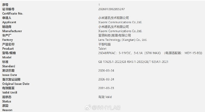 Redmi K Pad 2 został już certyfikowany w Chinach, sygnalizując zbliżającą się premierę. Tablet nosi numer modelu "26048RP6AC", z listą potwierdzającą wsparcie dla 67 W przewodowego ładowania - zmienionego z Redmi K Pad. Chociaż szczegóły dotyczące tabletu nie zostały potwierdzone, wydaje się prawdopodobne, że Redmi K Pad 2 będzie głównie iteracyjną aktualizacją, z najbardziej prawdopodobnymi zmianami polegającymi na wprowadzeniu układu MediaTek Dimensity 9500 a także większa bateria niż w zeszłorocznym modelu o pojemności 7500 mAh.