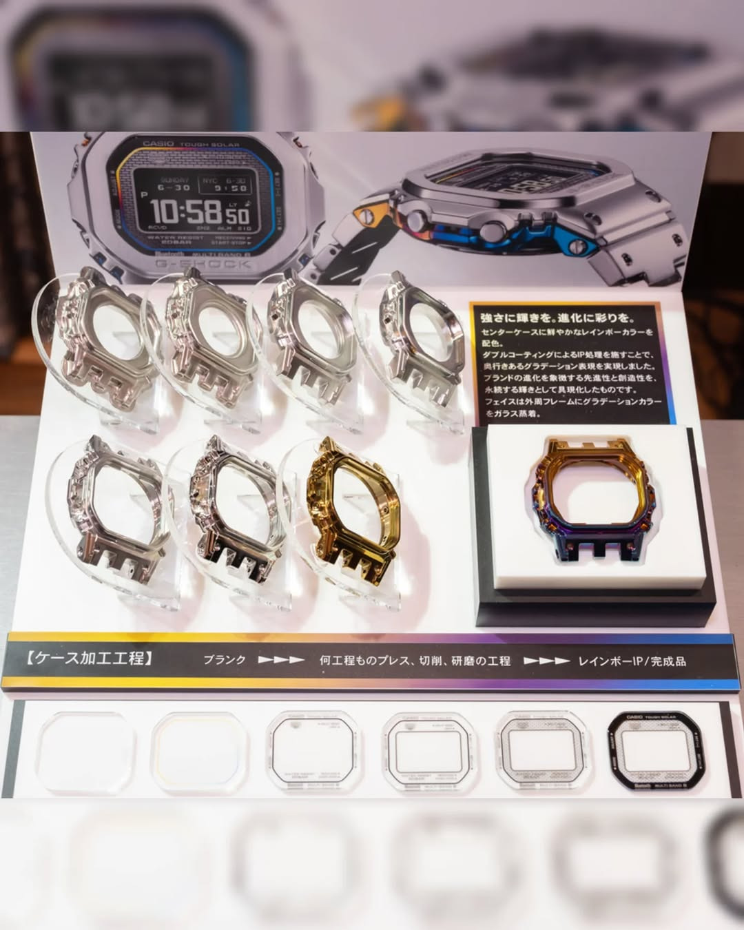 Jedno z wyraźniejszych ujęć pokazuje również warstwową konstrukcję koperty. Wiele niedokończonych metalowych powłok jest wyświetlanych obok ukończonej jednostki poddanej obróbce tęczowej, aby zobrazować wieloetapowy proces obróbki i wykończenia. Profil boczny pokazuje kolejny szczegół, który wcześniej nie był tak oczywisty. Bezel, obudowa i wewnętrzna struktura wydają się być bardziej podzielone na segmenty niż w starszych modelach GMW-B5000. Istnieją bardzo wyraźne przejścia między polerowanymi stalowymi powierzchniami a kolorową ramą wewnętrzną. Śruby i przyciski również nieznacznie kontrastują tonem.