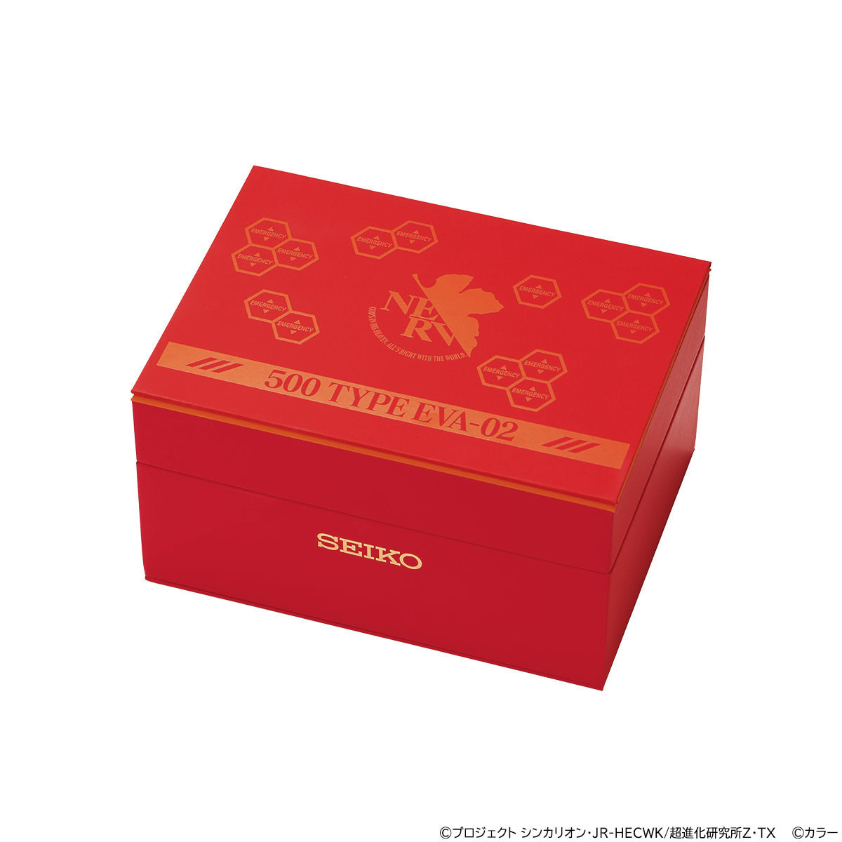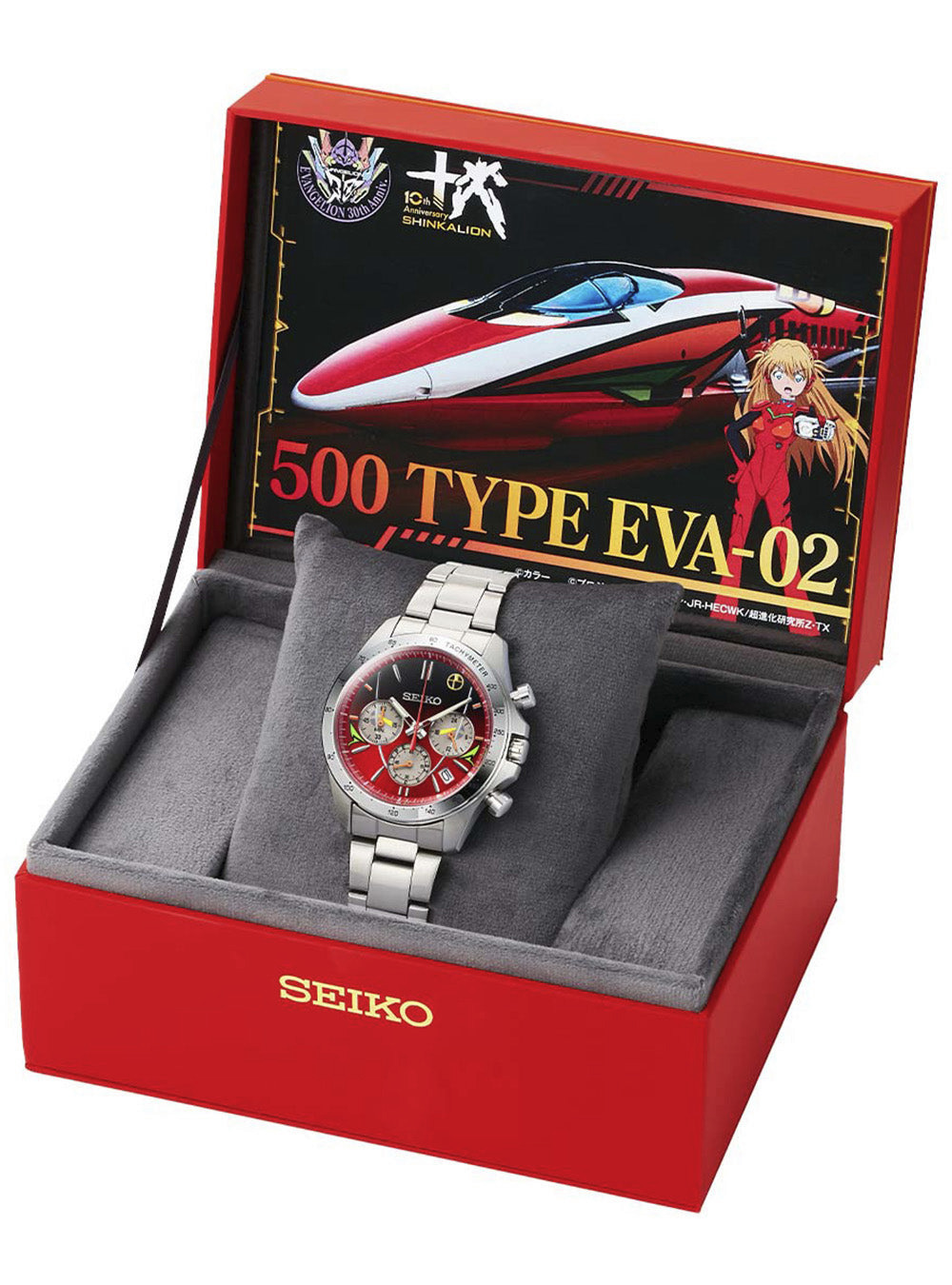 Zegarek nawiązuje do poprzednich kolaboracji Seiko Evangelion i Shinkalion, ale ten bardziej przypomina barwy pociągu 500 Type EVA-02, który kursował na linii Sanyō Shinkansen w ramach prawdziwego projektu rocznicowego Evangelion. Kolorystyka jest niemalże identyczna: czerwone sekcje zewnętrzne, czarny środek i metaliczne akcenty, które przypominają detale kabiny pociągu. Nawet znacznik na godzinie 1 odwzorowuje okrągłą ramę okna używaną w Shinkansenie EVA-02.