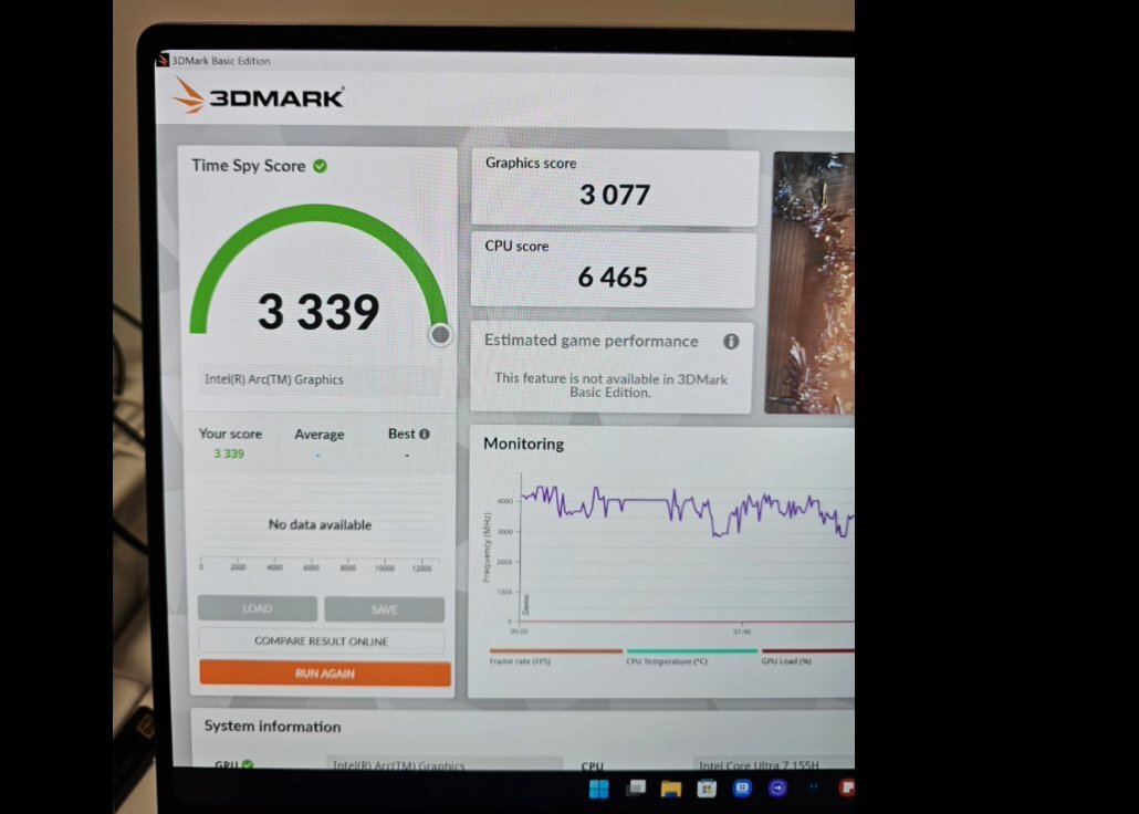 Przechodząc do testu Core Ultra 7 155H 3DMark Time Spy, wydaje się, że iGPU Xe-LPG uzyskało 3077 punktów przy zużyciu energii na poziomie 38 W. Proszę rzucić okiem na naszą bazie danych potwierdza, że iGPU Xe-LPG w Core Ultra 7 155H w tym przypadku wyprzedza nawet najwydajniejszą próbkę Radeona 780M, będąc jednocześnie o 18,5% szybszym niż średni wynik Radeona 780M. To wyraźnie kontrastuje z niedawnym wyciek z Moore's Law is Dead, który przedstawiał iGPU Xe-LPG jako znacznie słabsze niż obecne.