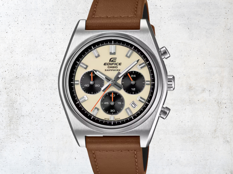 Metalowemu zegarkowi Edifice towarzyszy pasek z prawdziwej skóry w odcieniu opalenizny. Mówi się, że zegarek ten zachowuje dokładność do 20 sekund każdego miesiąca i powinien działać przez około trzy lata na baterii SR920SW. Ponadto jest wodoodporny do 100 m i posiada zakręcany dekielek.