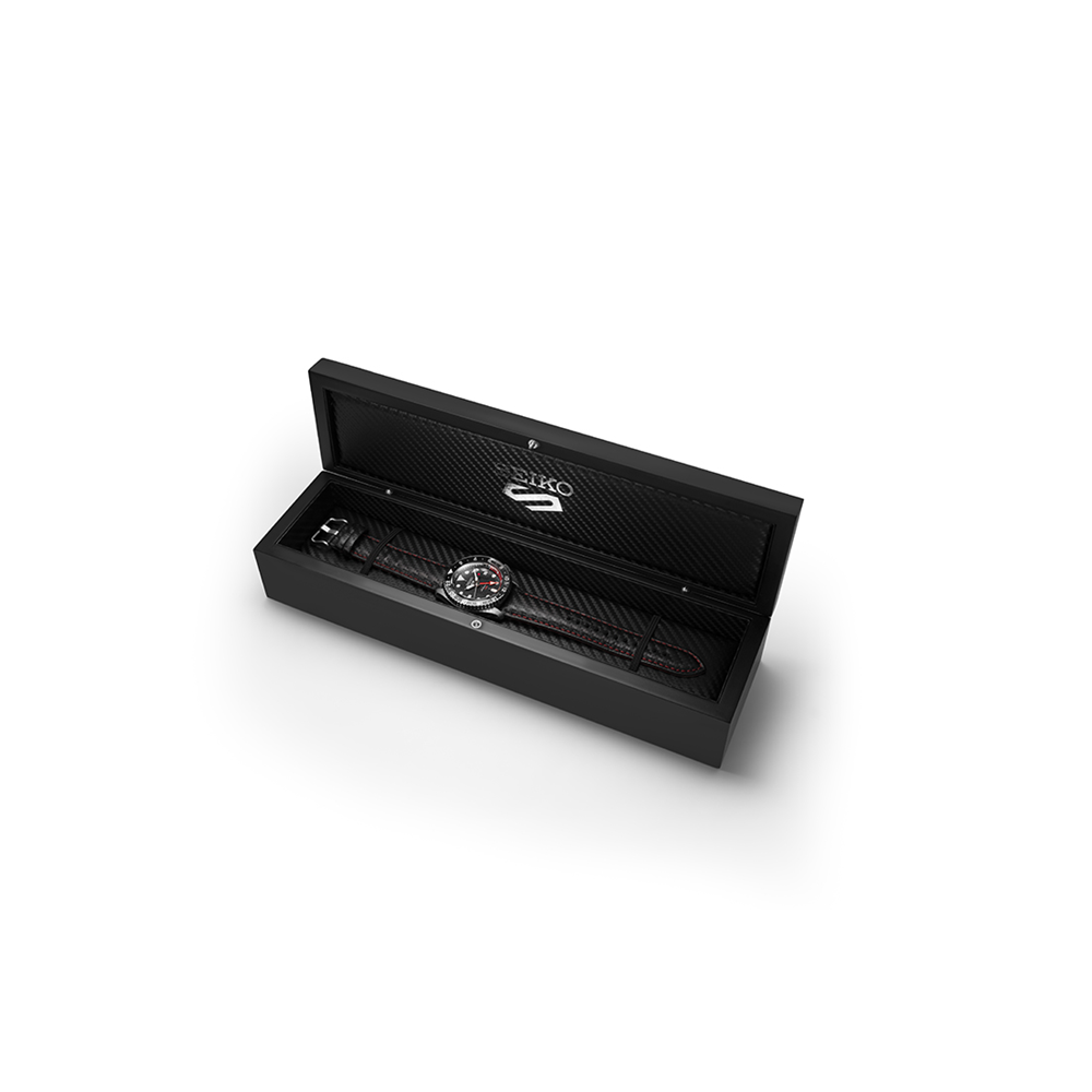 Zacznijmy od najbardziej oczywistej atrakcji: projektu, który mocno opiera się na swoich wyścigowych założeniach. Wzorzysta tarcza z włókna węglowego nadaje ton, nawiązując do lekkich materiałów stosowanych w nowoczesnych samochodach wyścigowych, podczas gdy czerwone akcenty podkreślają wewnętrzny pierścień rozdziału, wskazówkę GMT i sekundnik, a Lumibrite na wskazówkach i znacznikach godzin zapewnia czytelność w słabym świetle. Logo Supercars jest wygrawerowane zarówno na koronce, jak i na deklu, który zawiera również indywidualny numer limitowanej edycji każdego zegarka.