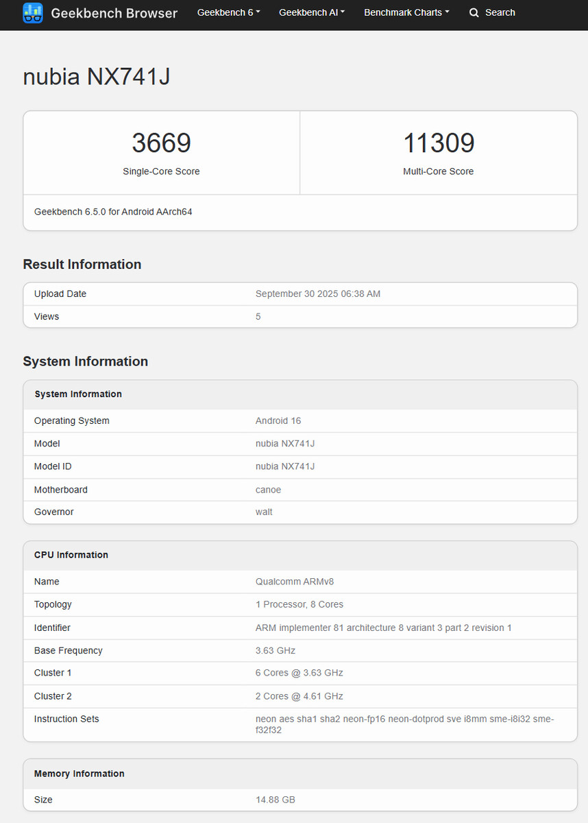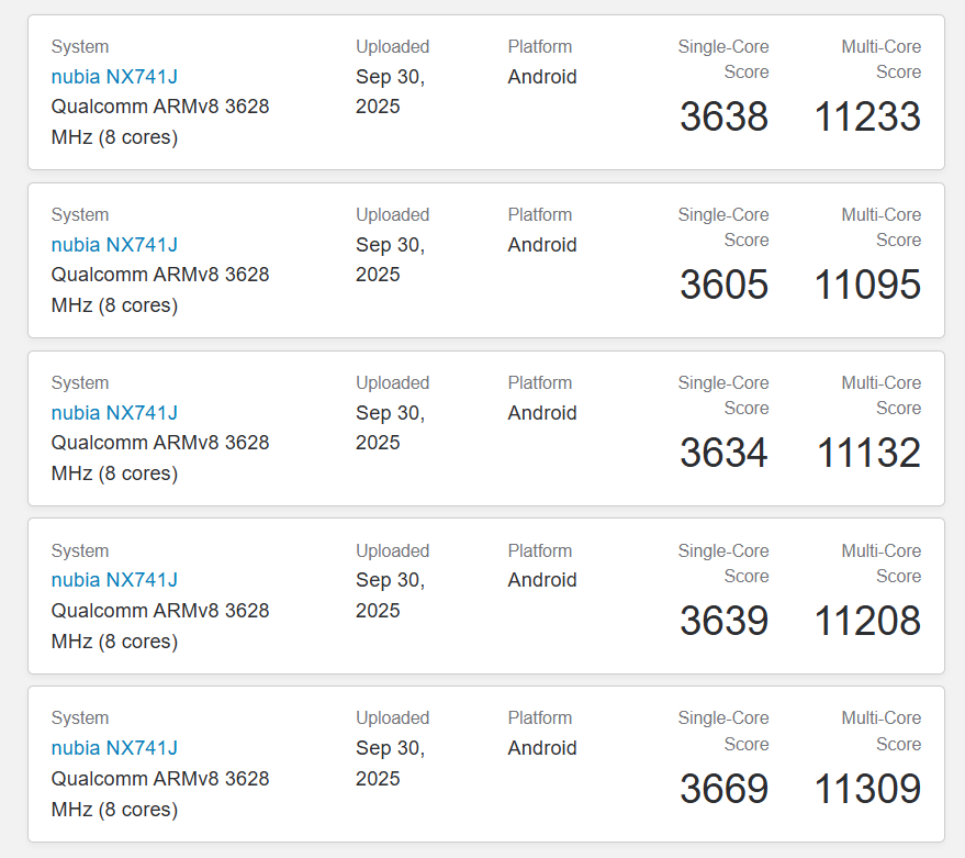Z drugiej strony, urządzenie o tym samym numerze modelu pojawiło się w Geekbench na wielu listach. Zamieszczone poniżej oferty potwierdzają, że Nubia oparła Z80 Ultra na nowym Qualcomm Snapdragon 8 Elite Gen 5 i 16 GB pamięci RAM. Uruchamiając Android 16, Nubia Z80 Ultra z łatwością przewyższa swojego poprzednika w jedno- i wielordzeniowych testach Geekbench ze średnimi wynikami odpowiednio 3 637 i 11 195.