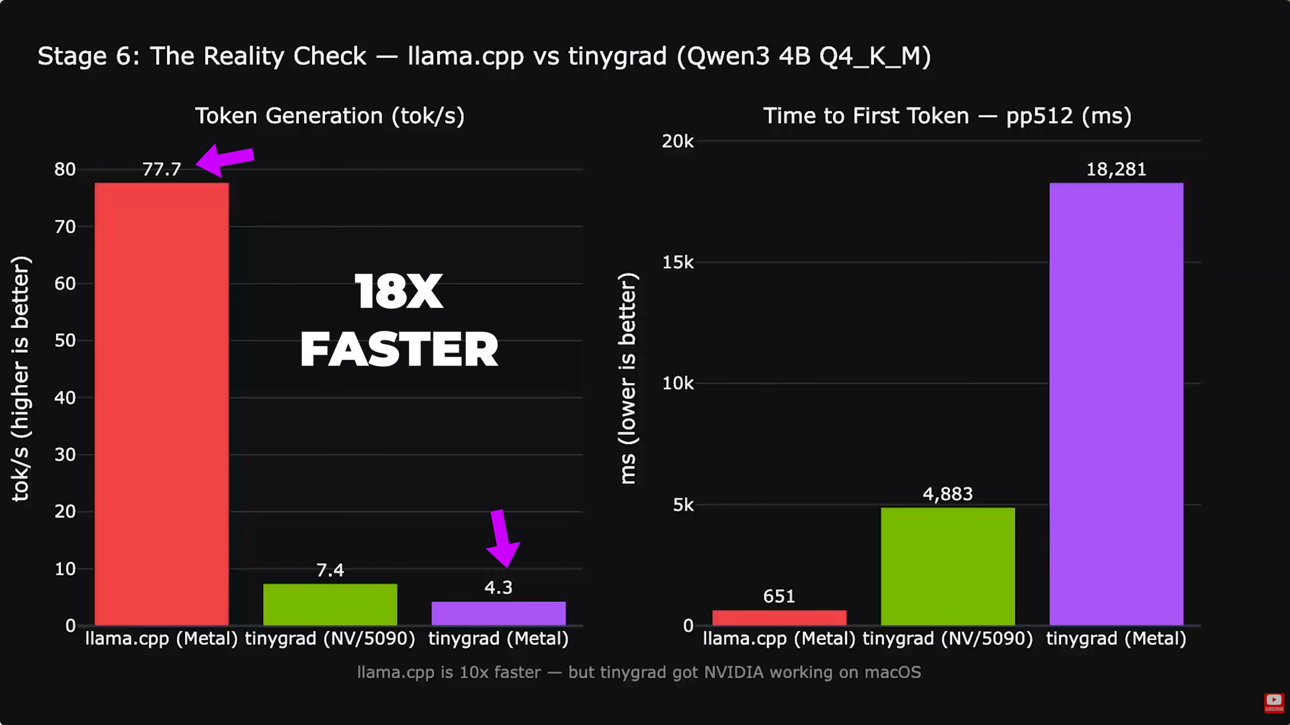 Chociaż połączenie jest stabilne, obecny stos oprogramowania jest na wczesnym etapie. Sterownik opiera się na kompilatorze Tiny Grad, a nie na natywnych optymalizacjach Metal lub CUDA. Tworzy to lukę w wydajności podczas ciężkich zadań obliczeniowych. Podczas uruchamiania modelu Llama 3.1 8Bkonfiguracja osiągnęła około 7,48 tokenów na sekundę. Chociaż jest to duża wygrana pod względem kompatybilności, nadal jest wolniejsza niż natywna Llama CPP na Metal, jak mówi Alex, która jest prawie dziesięć razy szybsza na równoważnym sprzęcie.