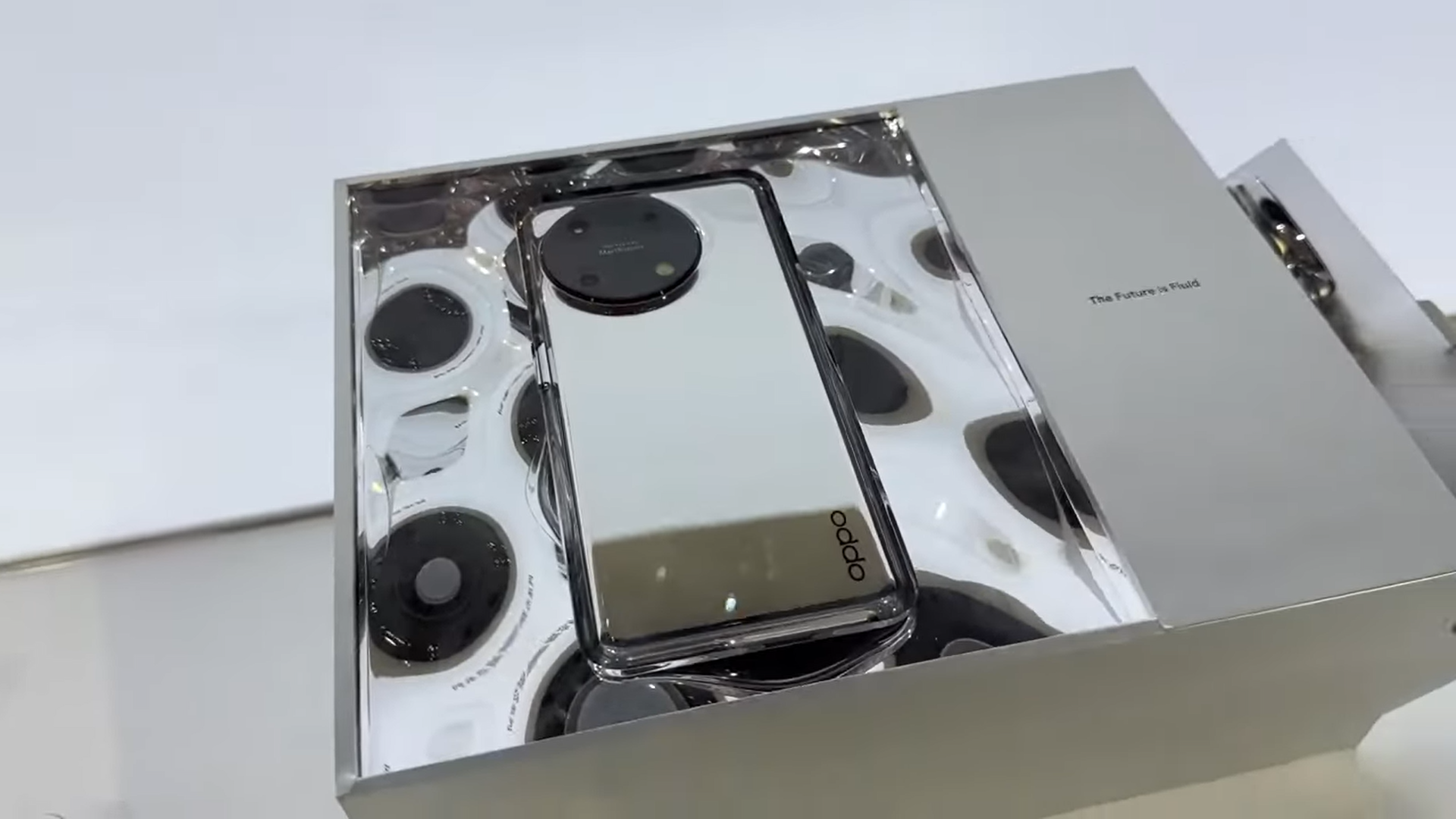 Wśród nich znalazł się smartfon wykonany z szkłaale bez konieczności stosowania ramki aby utrzymać go razem, jak zwykle. Mimo to, nadal ma miejsce na USB typu-C wycięte w jego dolnej krawędzi. Powstała w ten sposób "całkowicie szklana" obudowa (z wyjątkiem garbu na tylny aparat, mgliście przypominającego rendery związane z rzekomo nadchodzącym Find X6 Pro) ma wyjątkowo błyszczący, niemal płynny wygląd od tyłu