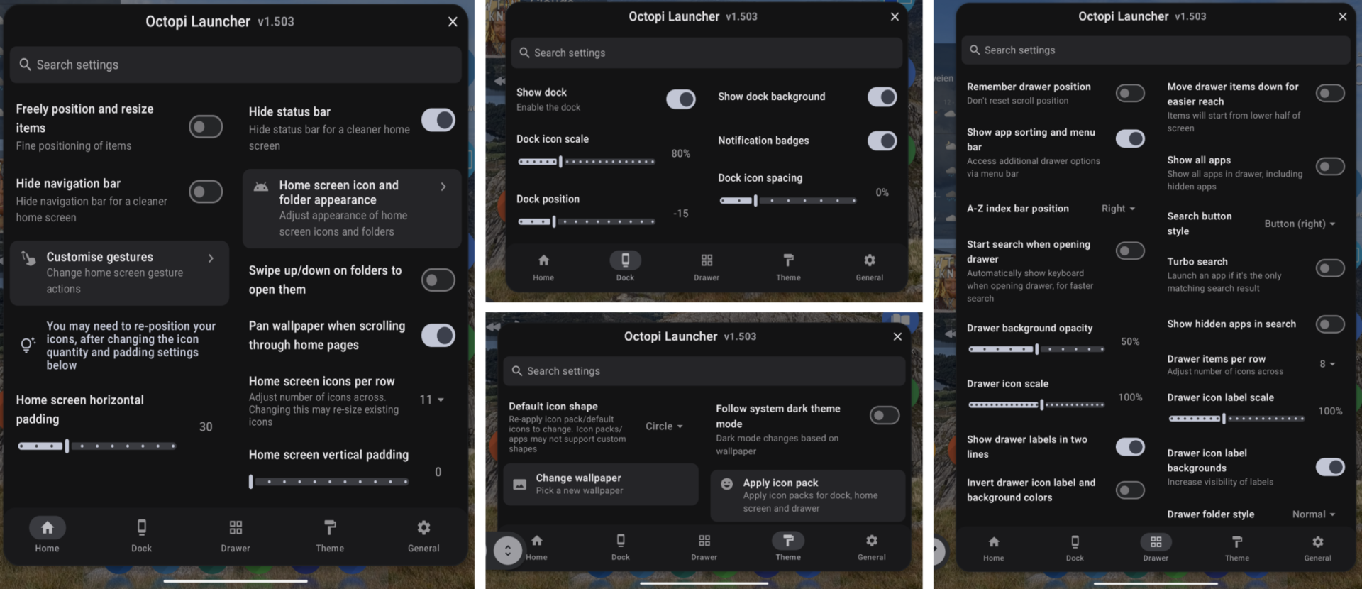 Rysowanie aplikacji można dostosować, w tym krycie tła, obsługę folderów, skalowanie etykiet i obniżanie wszystkich ikon do dolnej połowy ekranu w celu łatwiejszego dostępu. Oczywiście aplikacje można ukryć, a liczbę poziomych aplikacji można zmienić, aby dopasować je do ekranu o dowolnym rozmiarze.