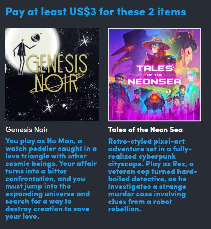 - Tales of the Neon Sea: Ta retro-pikselowa gra typu wskaż i kliknij przenosi użytkownika do oświetlonego neonami cyberpunkowego miasta, w którym jest detektywem Rexem. Gracz poszukuje wskazówek i rozwiązuje sprawę seryjnego morderstwa sprzed 13 lat. Tales of the Neon Sea kosztuje 16,99 USD na Steam i ma obecnie 4500 recenzji, z których 87% jest pozytywnych.