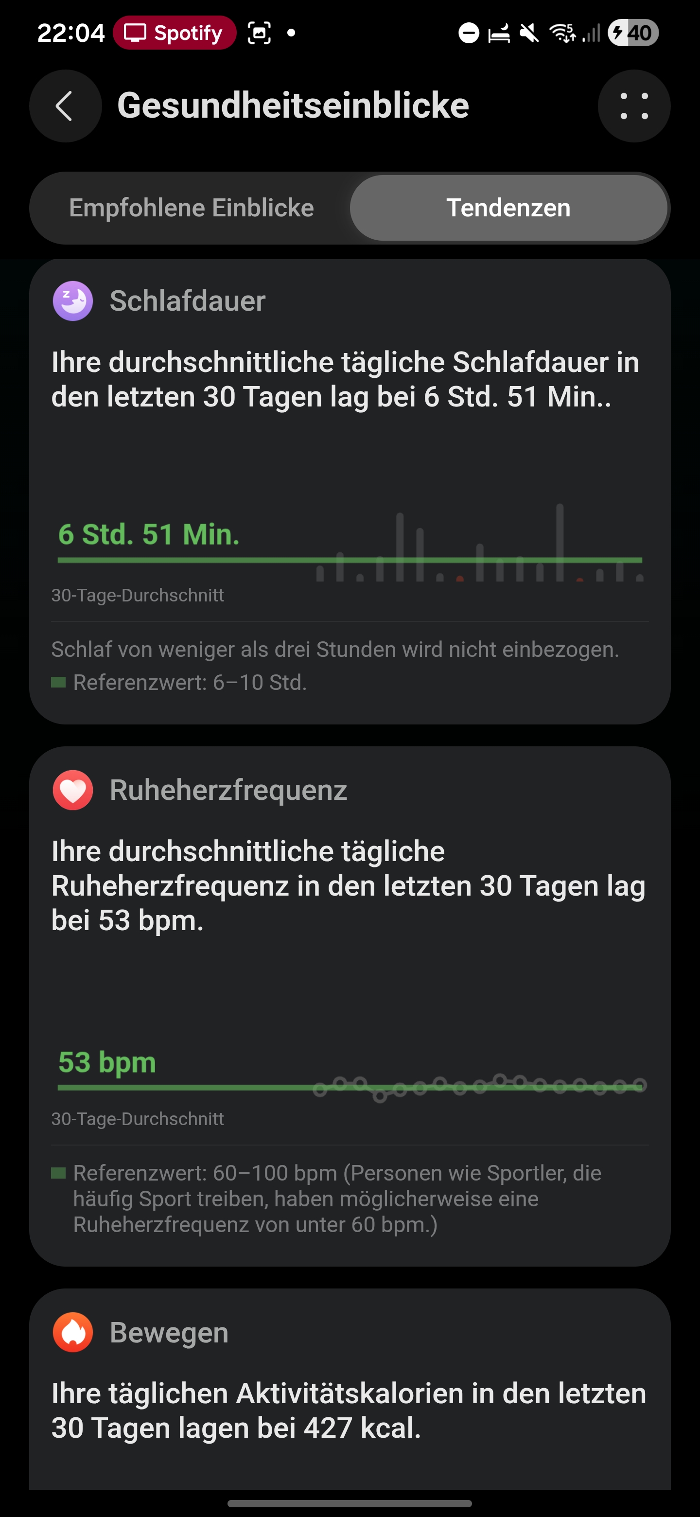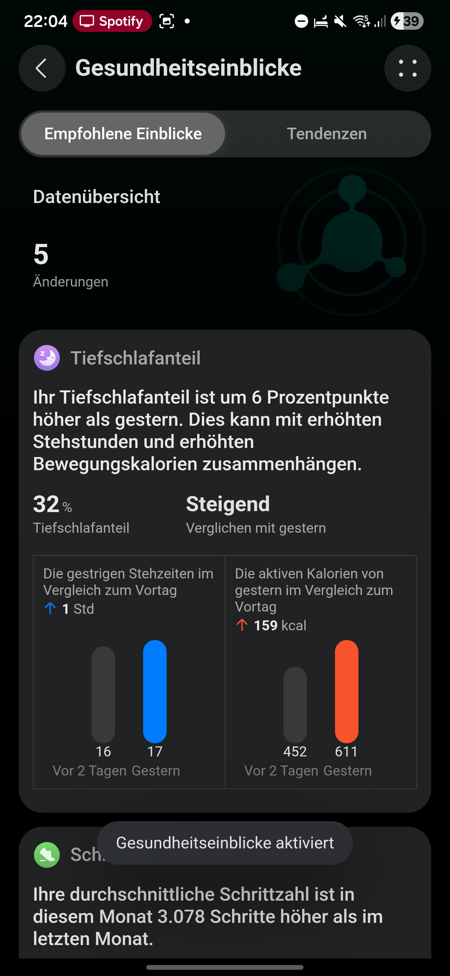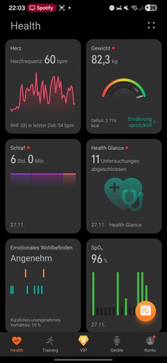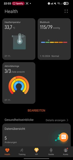 Testy można uruchomić ręcznie na zegarku, umieszczając palec na czujniku X-Tap, a zajmują one tylko około minuty. Poza indywidualnymi odczytami, oprogramowanie zapewnia również Health Insights, podkreślając zmiany i trendy, takie jak nietypowo wysokie tętno spoczynkowe.