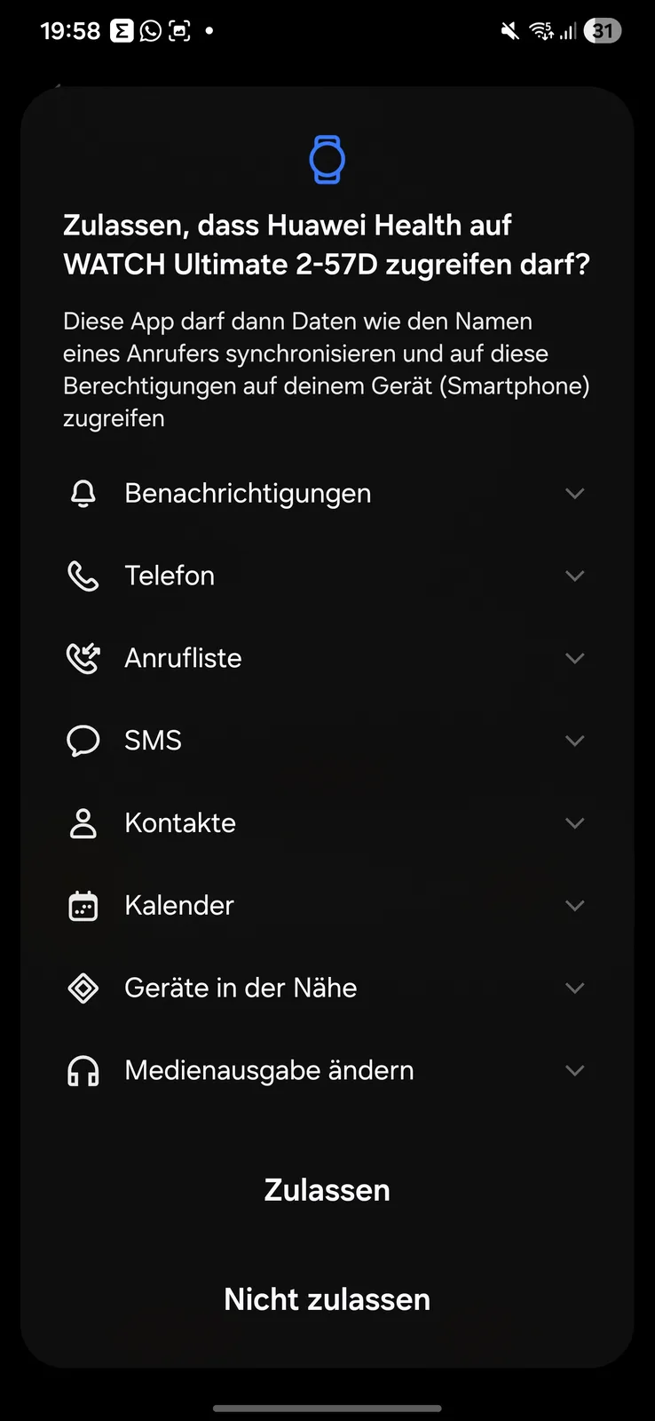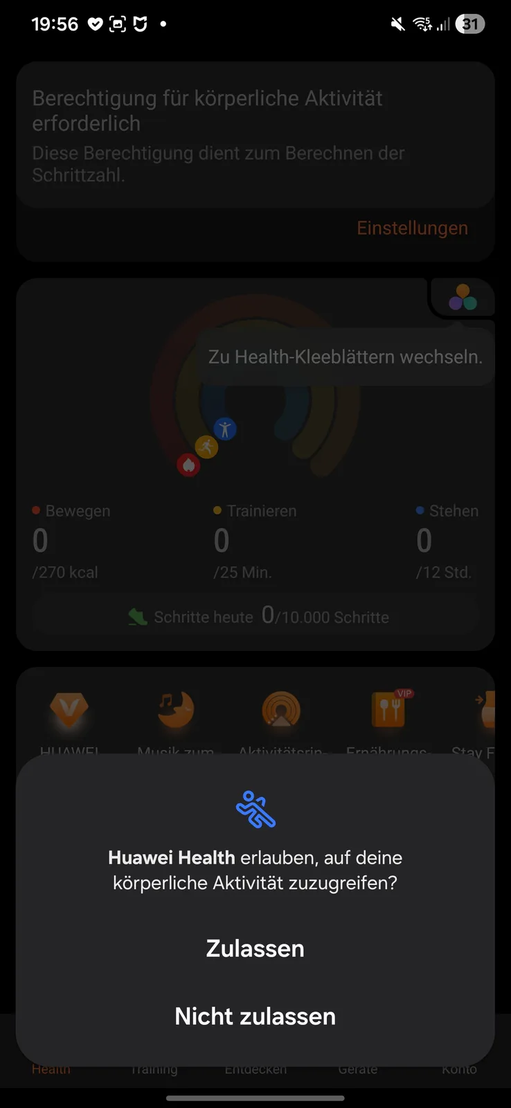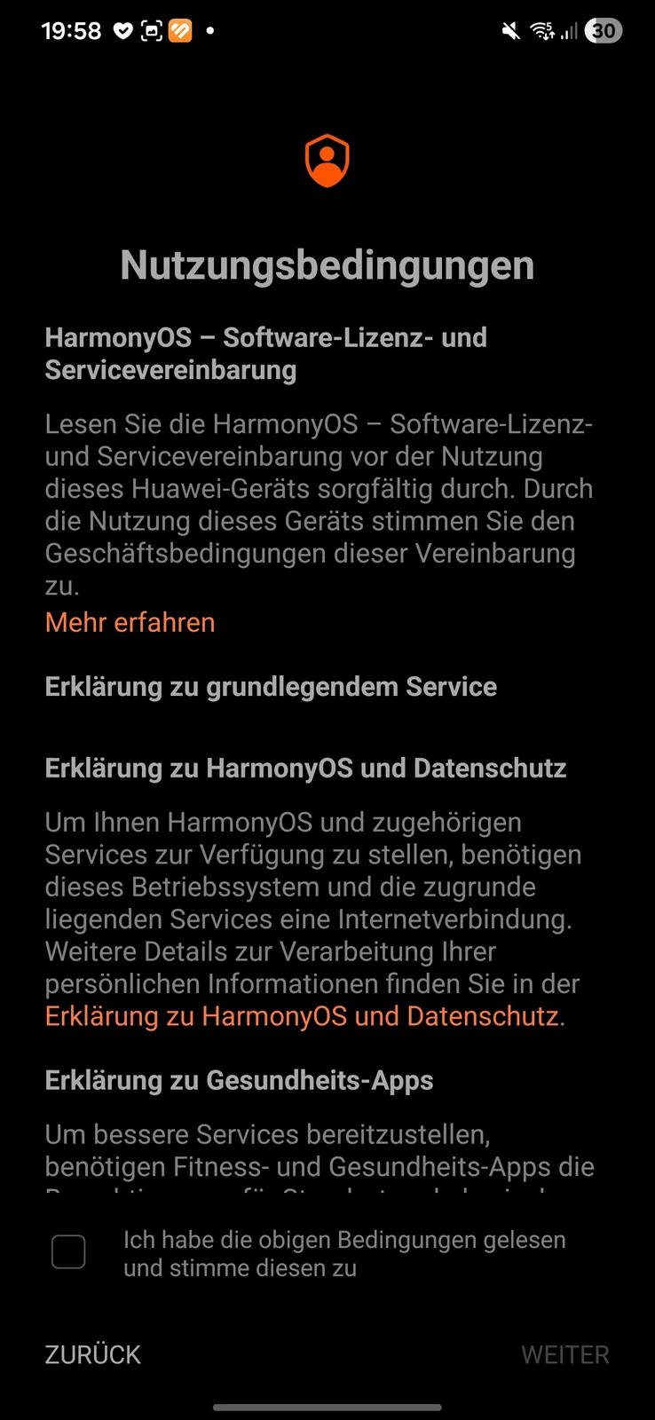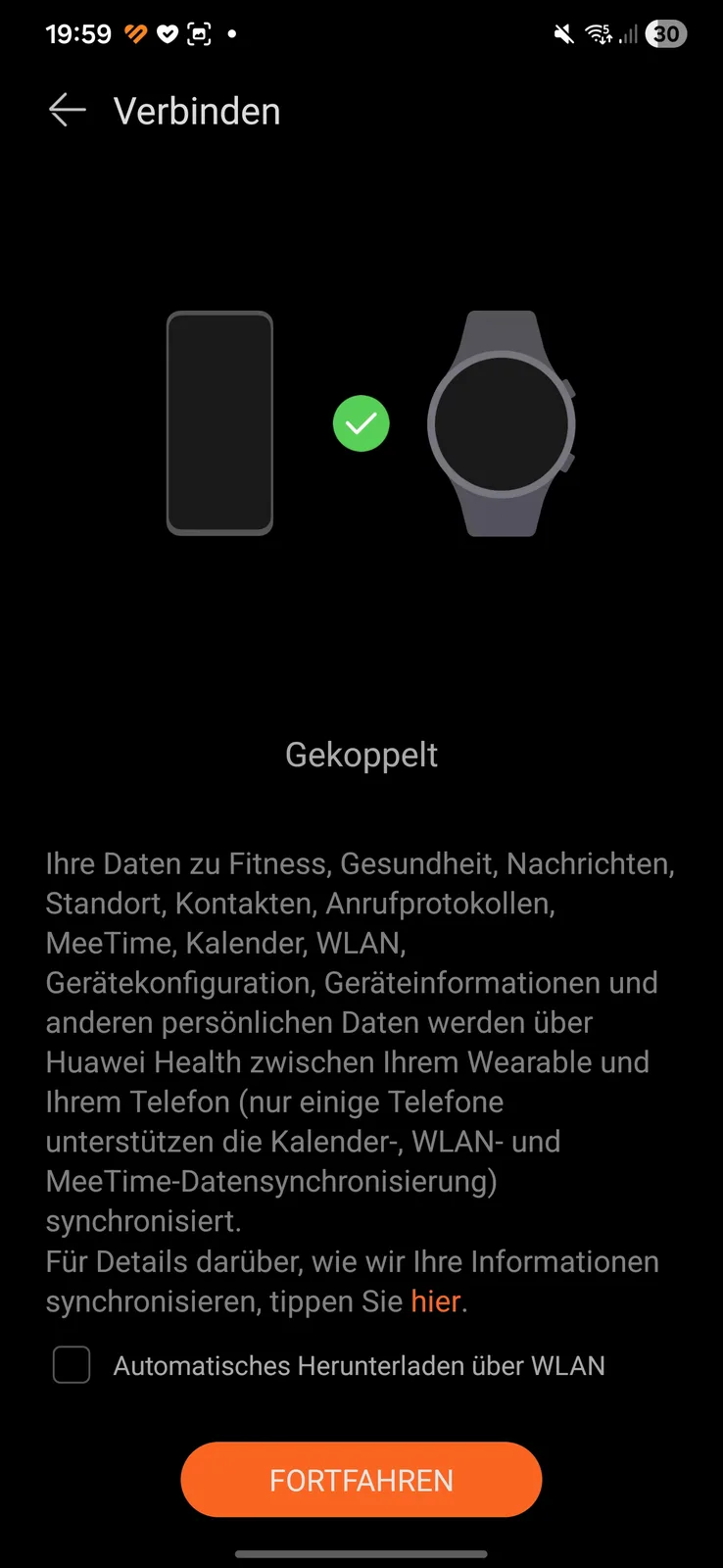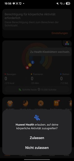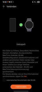 Podczas testów smartwatch został natychmiast wykryty i sparowany bez żadnych problemów. Podczas konfiguracji należy przyznać kilka uprawnień. Wymagany jest również identyfikator Huawei ID. Pod koniec procesu na zegarku uruchamia się samouczek. Jedna rzecz się wyróżnia: każda aplikacja otwarta na smartwatchu wymaga osobnej zgody na przetwarzanie danych.