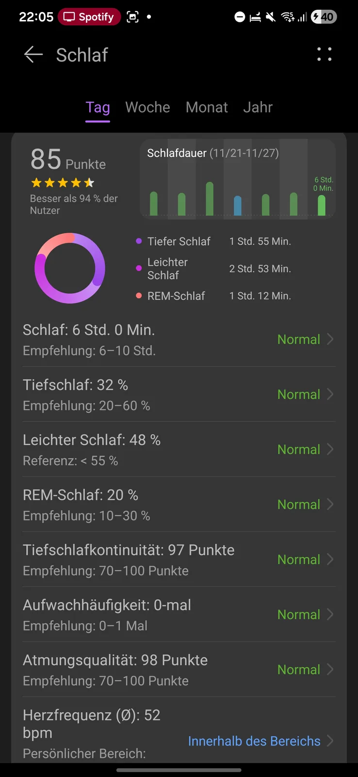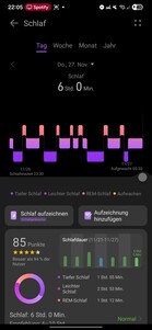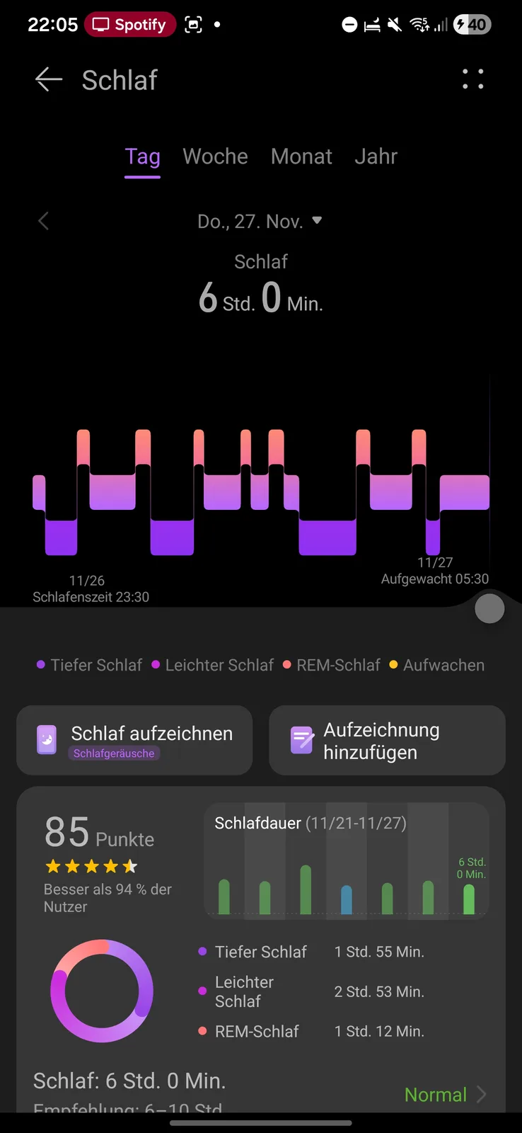 Huawei Watch Ultimate 2 oferuje rozbudowane funkcje śledzenia snu. Rejestruje różne etapy snu i pokazuje zarówno ich czas, jak i ich udział w całkowitym śnie. Etapy te są wizualizowane na osi czasu.