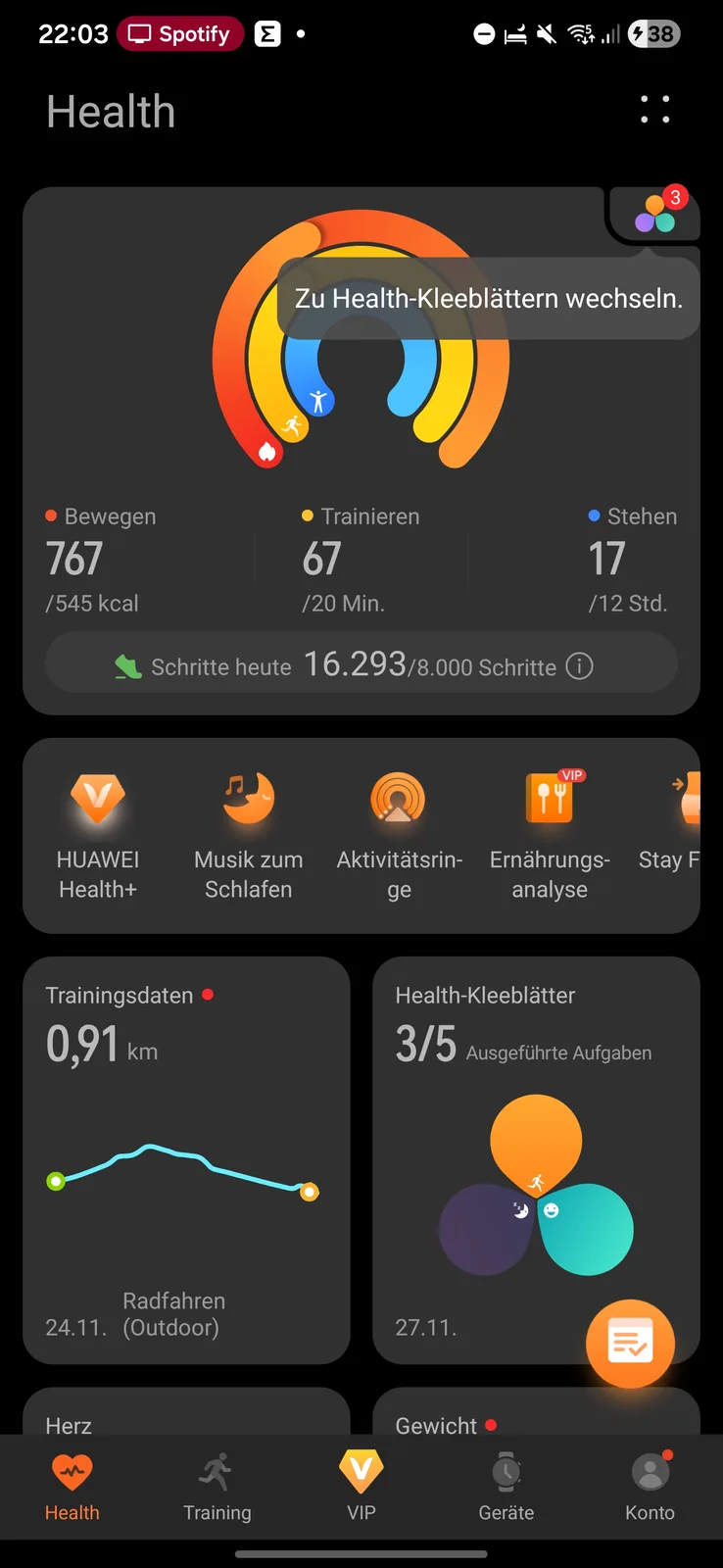 Huawei oferuje kilka formatów wizualnych dla celów aktywności. Oprócz znanych pierścieni, dostępny jest również układ koniczyny. Jego liście wypełniają się w ciągu dnia, a smartwatch śledzi codzienne wzorce i wyznacza cele, takie jak budzenie się w określonym przedziale czasowym lub pozostawanie aktywnym przez cały dzień.