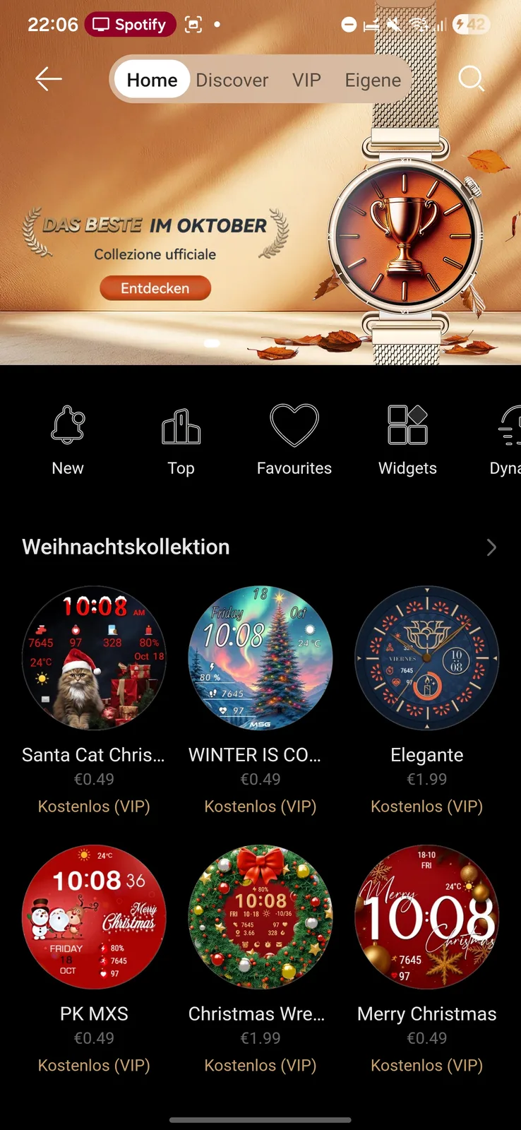 Ukończone treningi pojawiają się w sekcji Trening. VIP odblokowuje dostęp do płatnego poziomu Plus. Zakładka Urządzenia zawiera ustawienia, galerię aplikacji, zarządzanie muzyką i duży wybór tarcz zegarka.