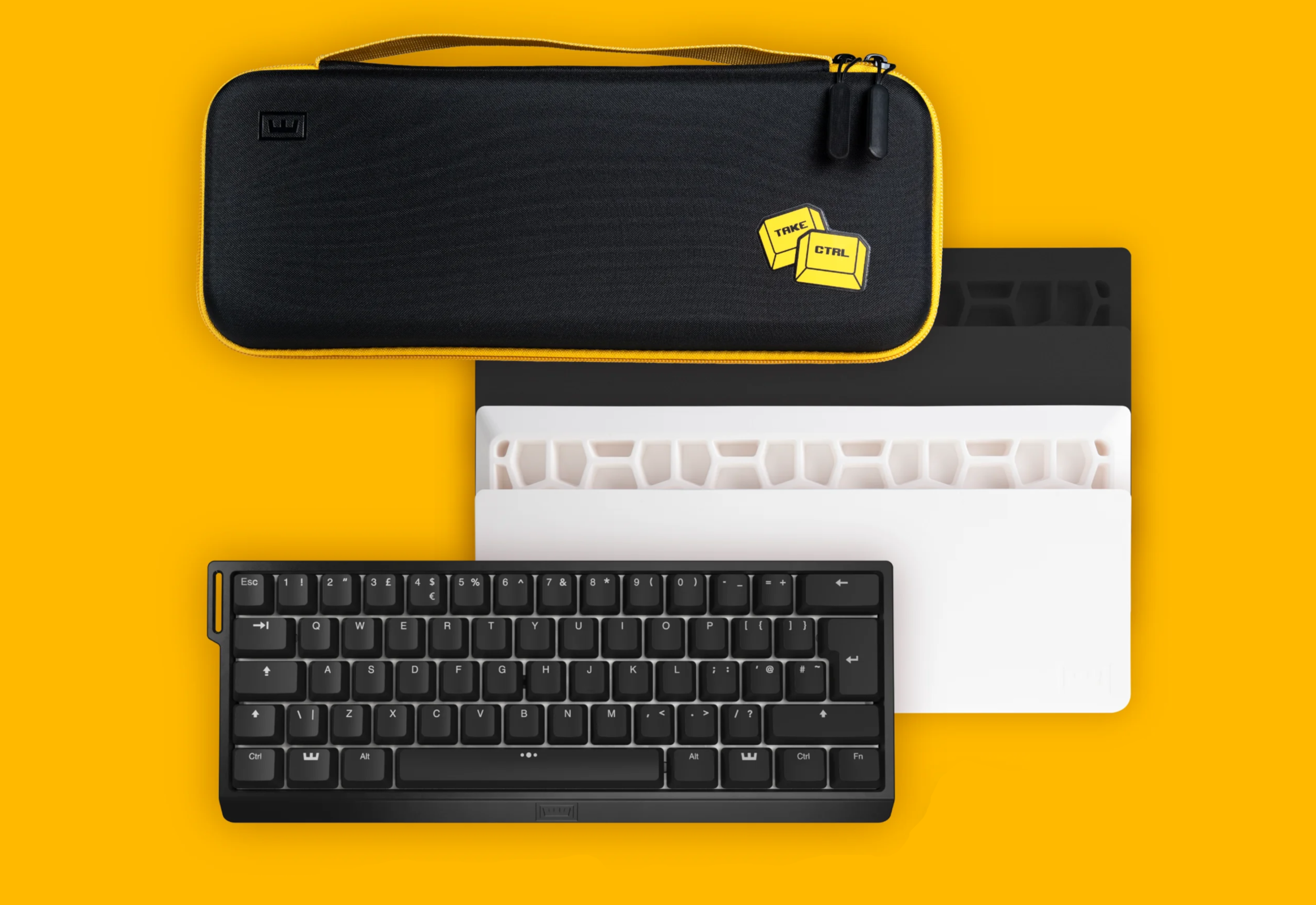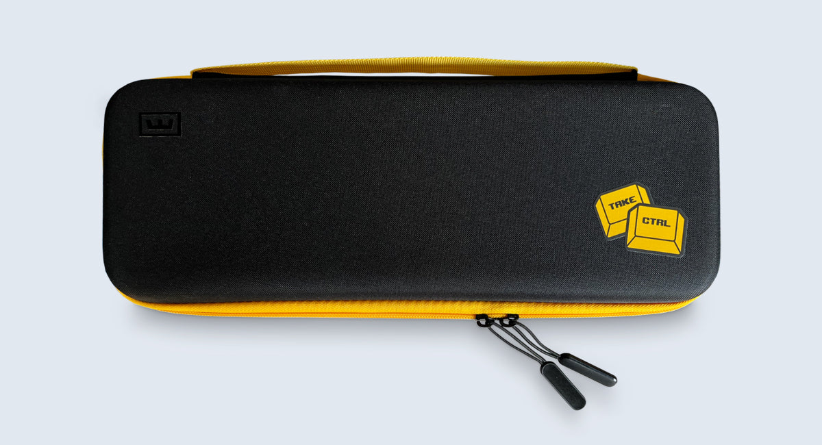 Darmowy futerał, który otrzymują Państwo wraz z klawiaturą Wooting 60HE z okazji Czarnego Piątku, jest podobny do futerału dołączonego do klawiatury Iqunix EZ63 Iqunix EZ63, który wcześniej recenzowaliśmy. Etui podróżne Wooting jest dostępne tylko w kolorze czarnym z żółtymi akcentami, pasującymi do standardowego paska 60HE, i jest wykonane z twardej skorupy EVA z miękkim aksamitnym wnętrzem, w którym klawiatura może się zagnieździć. Podobnie jak sama klawiatura 60HE, etui jest wyraźnie kompatybilne z innymi klawiaturami 60% "o podobnych wymiarach"