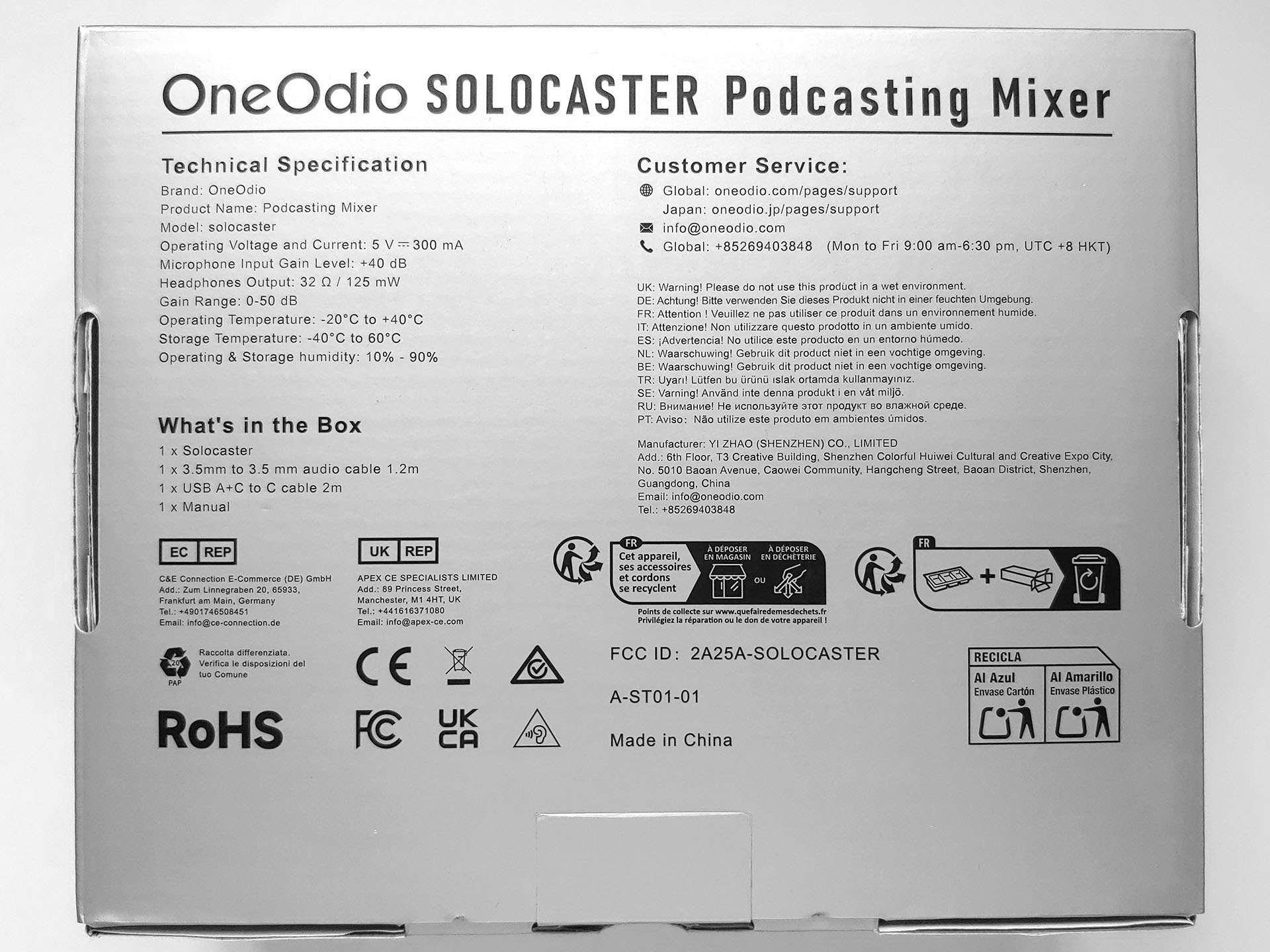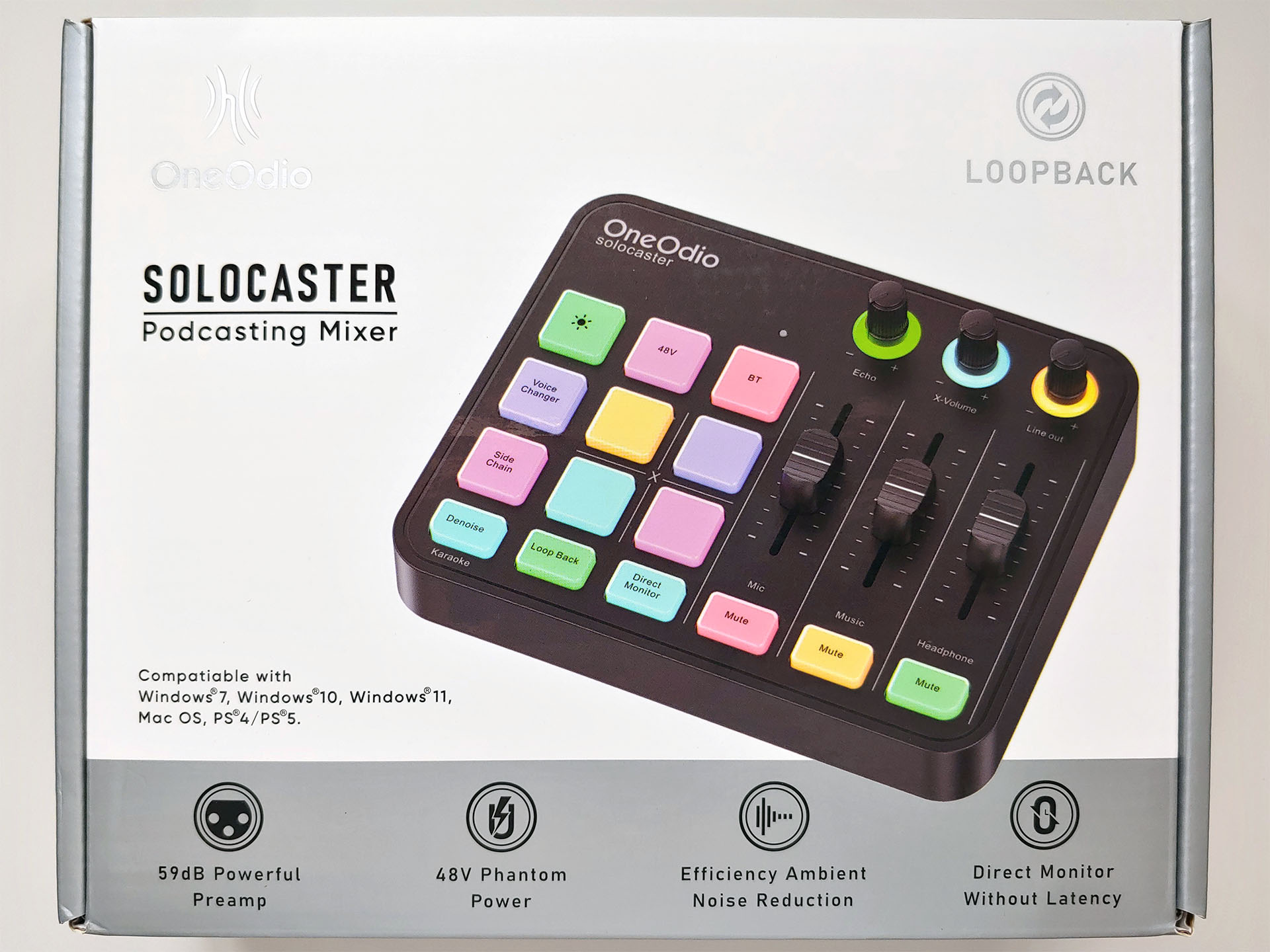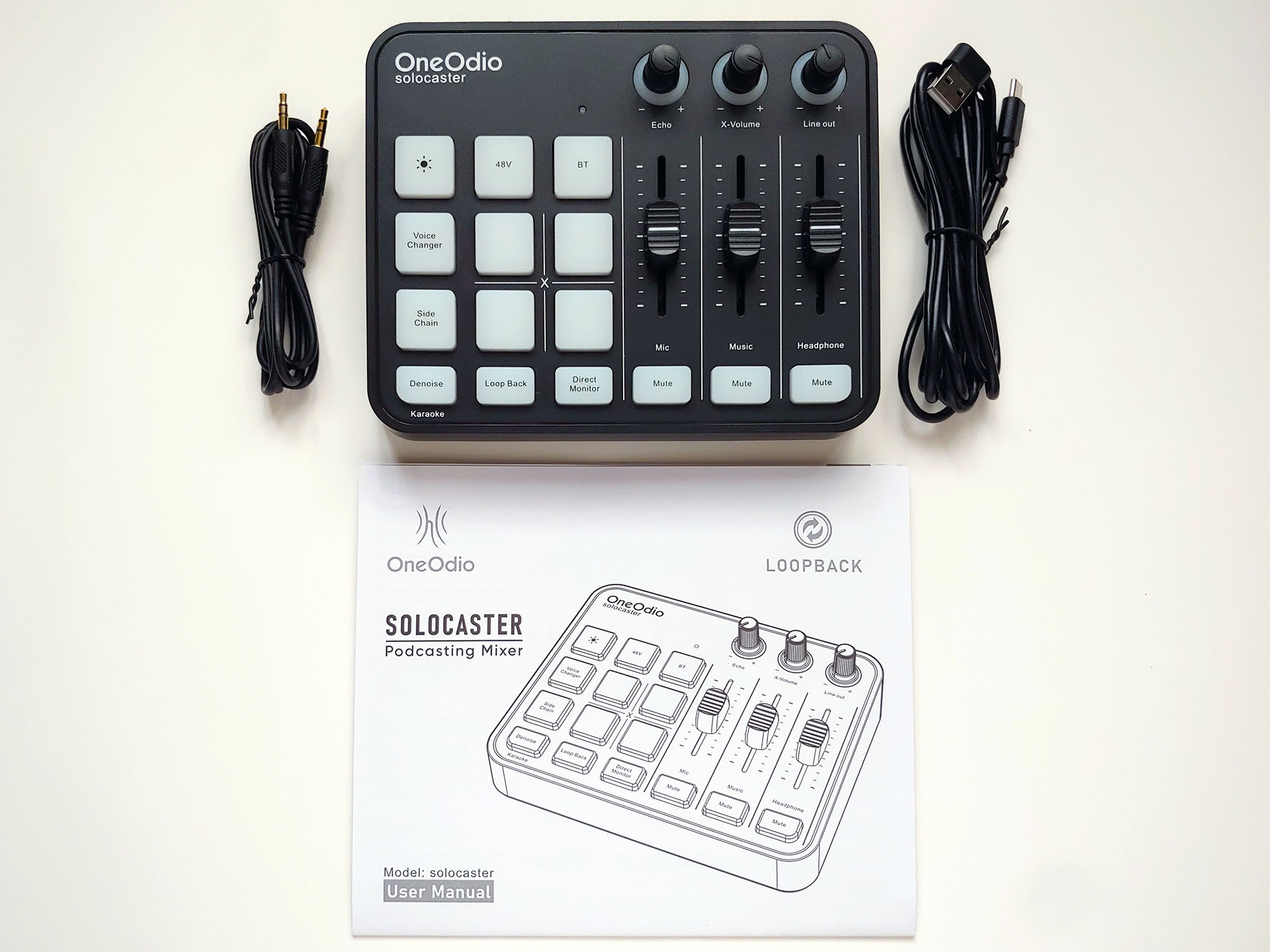 OneOdio Solocaster pojawił się jako urządzenie dźwiękowe w systemie Windows i zapewnił bardzo użyteczny zmiksowany dźwięk z wystarczająco niskim poziomem szumów (~-50 do -60 dB) do użytku w aplikacjach do przesyłania strumieniowego, takich jak OBS, z oczekiwaną latencją łatwo skorygowaną. Po sparowaniu z tanimi mikrofonami o przyzwoitej jakości dźwięku i odrzuceniu dźwięku poza osią, takimi jak Tascam, wyjście z miksera w cichych pomieszczeniach mogło być używane bez dalszego przetwarzania dźwięku.