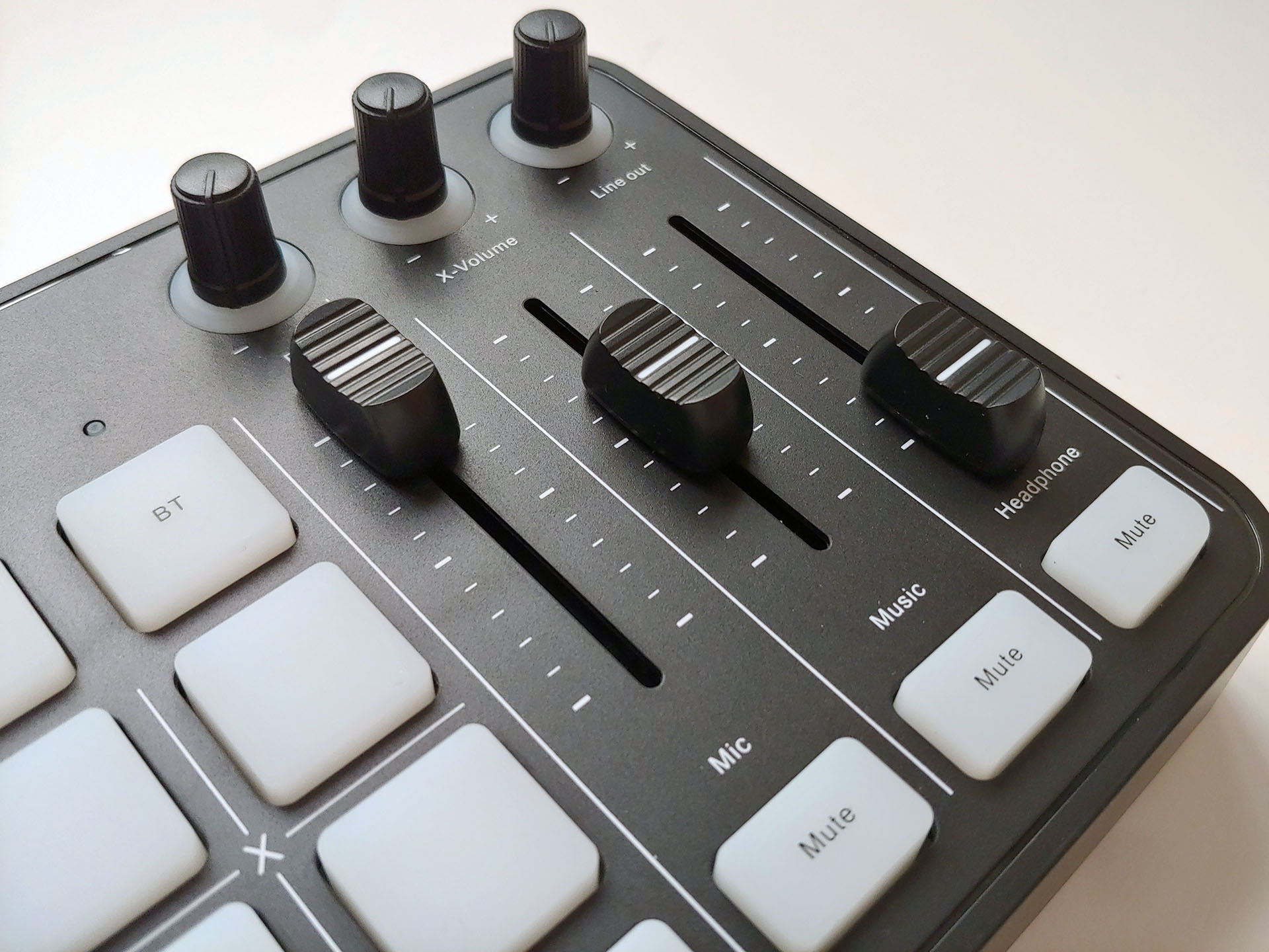 Suwaki są dość płynne, ale wymagają bardziej stabilnego dotyku w porównaniu z profesjonalnymi mikserami, aby jednocześnie płynnie regulować wszystkie trzy jedną ręką. Suwak mikrofonu kontroluje tylko głośność połączonych wejść XLR i mikrofonu słuchawkowego, więc jedynym sposobem na zrównoważenie głośności dwóch głośników jest przesunięcie mikrofonów.