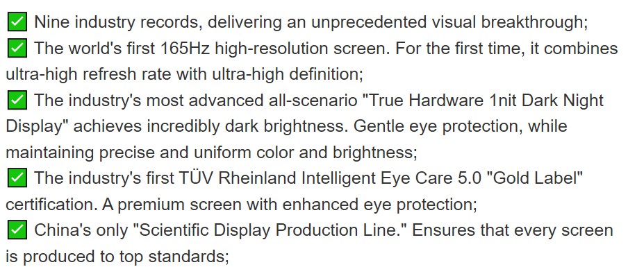 Ze względu na ograniczenia w materiałach luminescencyjnych i technologii obwodów, branża nie jest obecnie w stanie osiągnąć specyfikacji 165 Hz i 2K jednocześnie. Ekran 165 Hz + 1,5K X3 jest optymalnym rozwiązaniem i szczytem technologii wyświetlania w telefonach komórkowych. Wcześniej najwyższą rozdzielczością dla ekranów 165 Hz o ultra wysokiej częstotliwości odświeżania w telefonach komórkowych było tylko 1080p. Ten ekran X3 jest pierwszym w branży ekranem 165 Hz + 1,5K. Po latach weryfikacji rynkowej, ekrany 1,5K stanowią obecnie doskonałą równowagę między najwyższą jakością wyświetlania a wydajnością energetyczną w wielu flagowych telefonach głównych marek, więc nie ma potrzeby martwić się o rzeczywiste wrażenia. Po drugie, ultrawysoka częstotliwość odświeżania 165 Hz zapewnia niespotykaną płynność i jest przyszłością ekranów telefonów komórkowych.