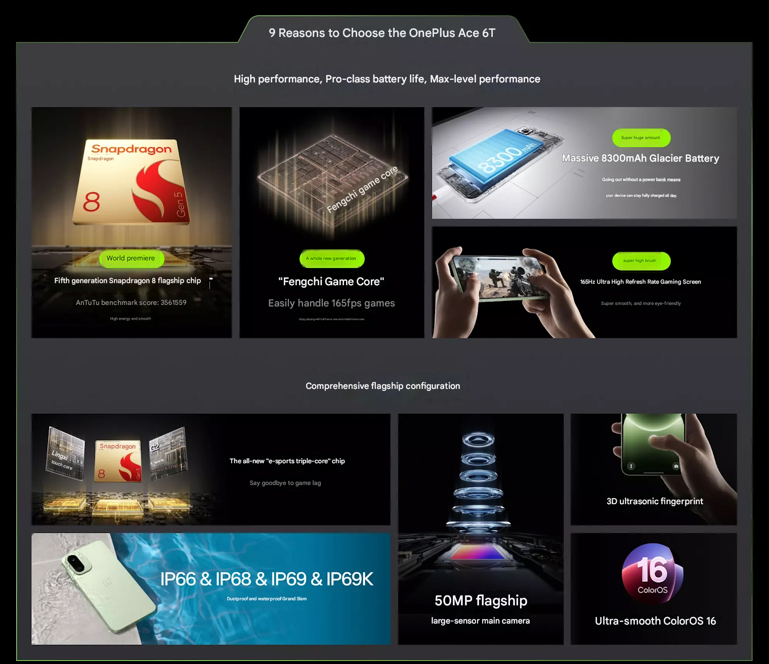 Co więcej, wyświetlacz Ace 6T ma na celu zapewnienie wysoce responsywnych wrażeń dzięki częstotliwości odświeżania 165 Hz i częstotliwości próbkowania dotyku 3200 Hz https://global.redmagic.gg/blogs/product-information/how-touch-sampling-and-screen-refresh-rates-shape-your-gaming-experience. OnePlus dodaje, że ekran ten ma flagową konfigurację, w tym technologię Rain Touch 2.0 zapewniającą lepszą reakcję na dotyk, gdy ekran jest mokry, oraz "flagowy" ultradźwiękowy czytnik linii papilarnych do szybkiego odblokowywania.