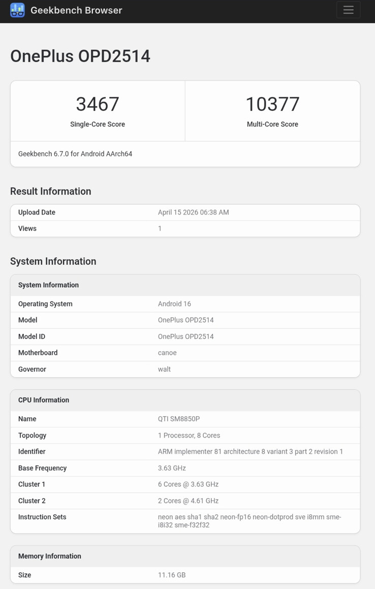 Niemniej jednak to, co wydaje się być nowym tabletem OnePlus, pojawiło się teraz w Geekbench. Osadzony poniżej, jednordzeniowy wynik 3,467 znajduje się na dolnym końcu tego, czego oczekujemy od Snapdragon 8 Elite Gen 5 chipsetu. W rzeczywistości ten wczesny wynik pokazuje, że podobno Pad 3 Pro podąża za mniejszym OnePlus 15. Podobnie, wielordzeniowy wynik tabletu wynoszący 10 395 uplasowałby go na drugim miejscu w naszej wielordzeniowej tabeli liderów Geekbench 6.