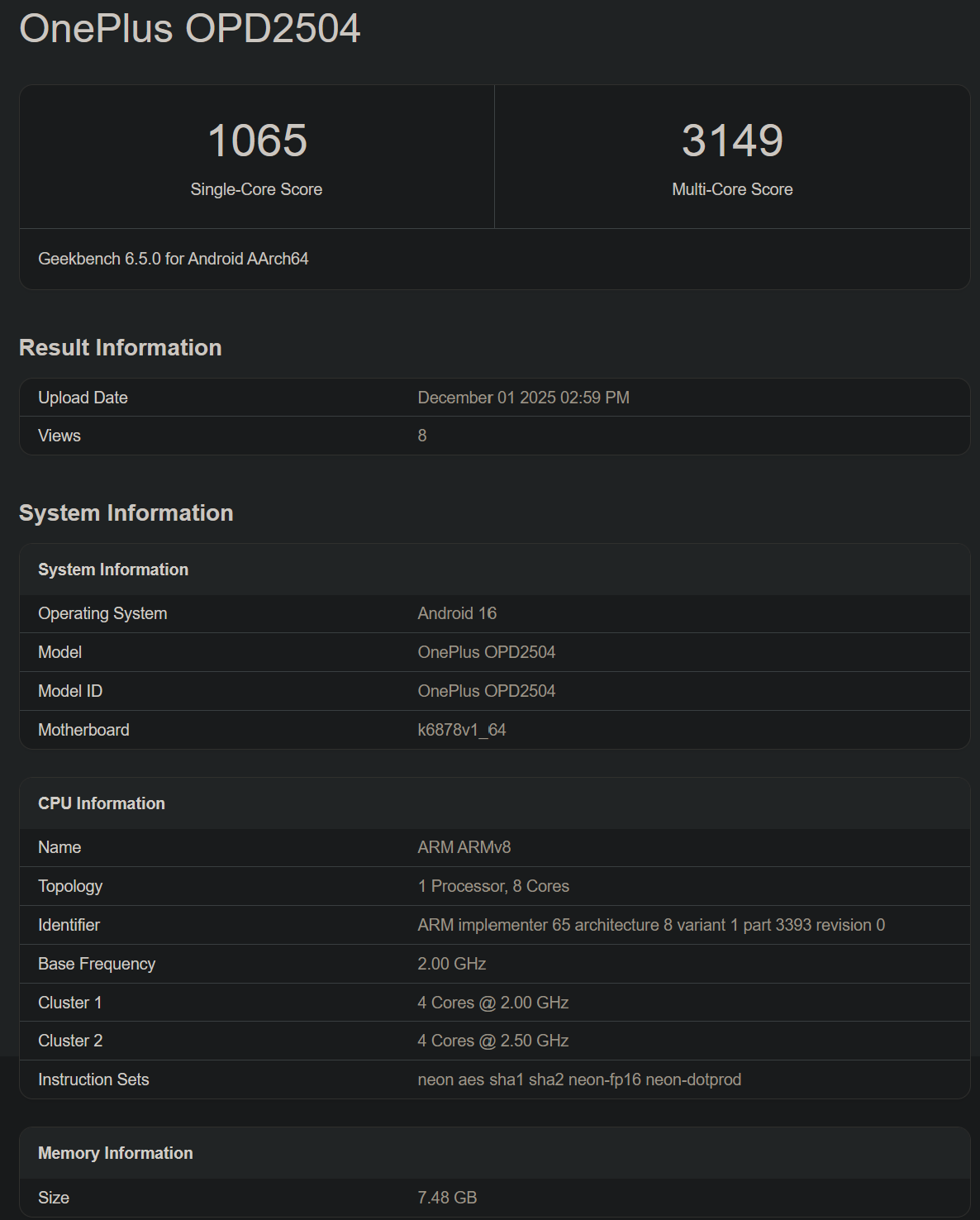 Przybywa z tabliczką OnePlus OPD2504 i czymś, co wygląda jak MediaTek Dimensity 7300 SoC z czterema rdzeniami P o taktowaniu 2,5 GHz, czterema rdzeniami E o taktowaniu 2,0 GHz, procesorem graficznym Arm Mali-G615 MC2 i 8 GB pamięci systemowej. Uzyskał on wyniki 1065 i 3149 punktów w testach Geekbench dla pojedynczego i wielu rdzeni, co jest porównywalne ze średnim wynikiem Dimensity 7300.