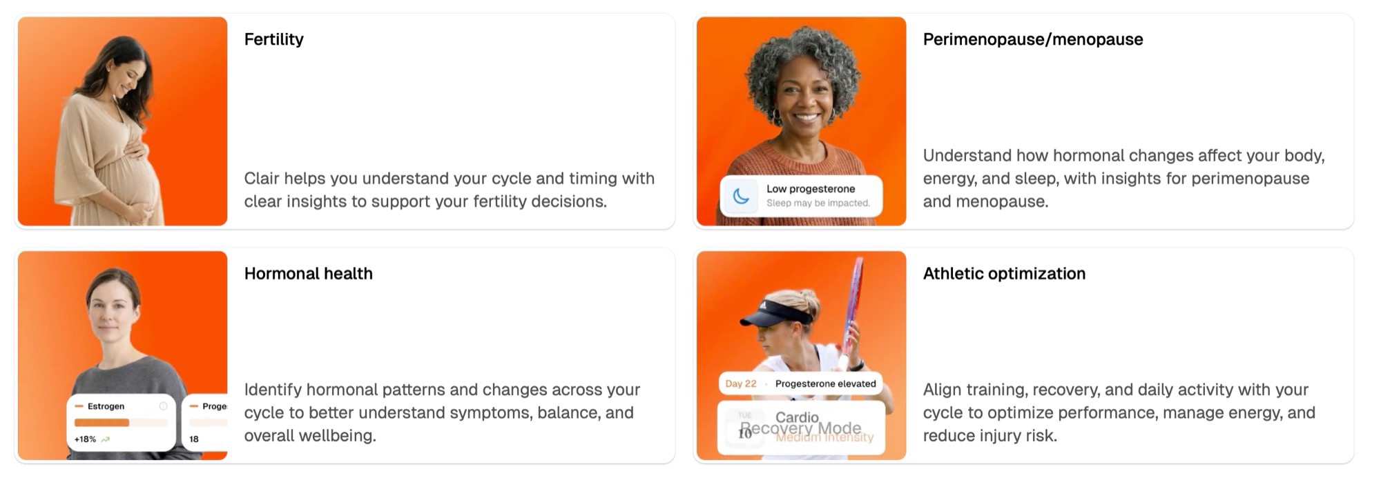 Towarzysząca aplikacja na smartfony została zaprojektowana w celu obliczenia dokładnego okna płodności w oparciu o dane hormonalne. Co więcej, poziom estrogenu ma zapewnić cenny wgląd w wyniki sportowe, pomagając użytkownikom określić optymalny czas na intensywny trening. Clair Health jest skierowany przede wszystkim do sportowców, kobiet doświadczających menopauzy i planujących ciążę.
