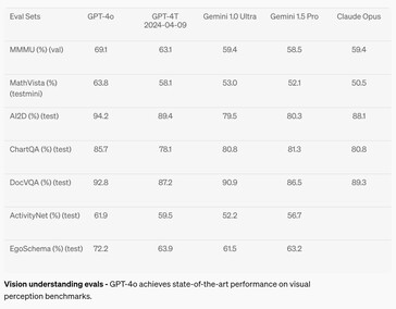 W dziedzinie percepcji wzrokowej, takiej jak rozumienie diagramów, GPT-4o poprawił się od 2 do 10,8% w stosunku do konkurencyjnych modeli AI w siedmiu testach, ale osiągnął poziom klasy A (powyżej 90%) tylko w dwóch testach. Matematyka pozostaje bardzo dobrym testem możliwości AI, a sztuczna inteligencja zawiodła z wynikiem 63,8% w teście MathVista na pytania, na które może odpowiedzieć absolwent szkoły średniej.