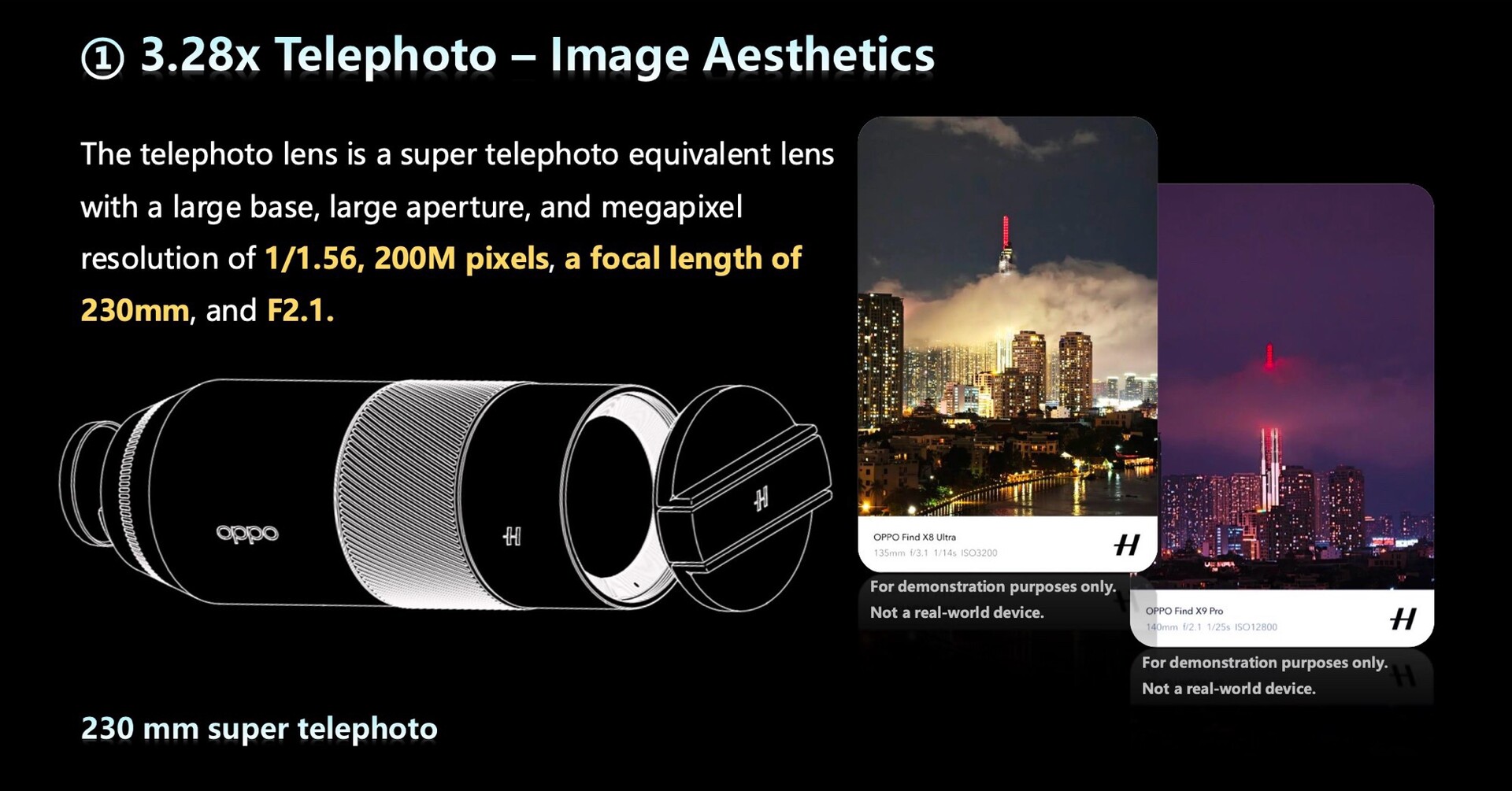 Ten teleobiektyw ma ekwiwalent ogniskowej 35 mm wynoszący 70 mm i przysłonę f/2.1. Dla tych, którzy chcą jeszcze większego zasięgu, Oppo oferuje opcjonalny konwerter teleobiektywu, który skutecznie zwiększa ogniskową teleobiektywu peryskopowego do 230 mm (odpowiednik 35 mm), dając smartfonowi 10-krotny zoom optyczny.