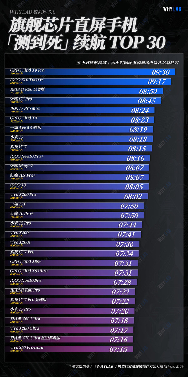 Podobna seria testów przeprowadzonych przez WhyLab daje identyczne wyniki. Find X9 Pro wychodzi na szczyt z całkowitym czasem 9h30m, podczas gdy Xiaomi 17 Pro Max trwa zaledwie 8h24m.