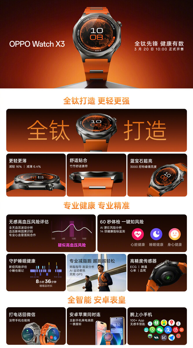 Tymczasem dołączona bateria o pojemności 646 mAh ma wytrzymać do 5 dni w trybie smartwatcha. Procesor Snapdragon W5 powinien pomóc Watch X3 działać do 16 dni w trybie oszczędzania energii. Watch X3 obiecuje również zestaw czujników monitorujących stan zdrowia, w tym te dedykowane do wykonywania EKG i sprawdzania temperatury skóry. Oppo pobiera 2 799 CNY (~405 USD) za Watch X3 w kolorze czarnym, pomarańczowym i tytanowym.