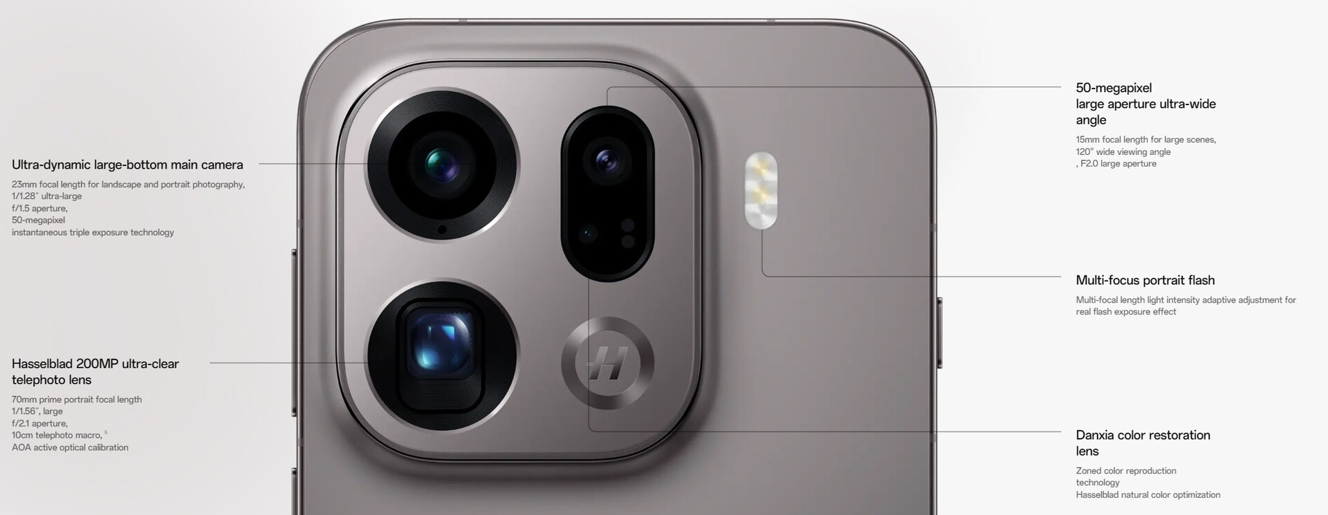 Oprócz gigantycznej baterii o pojemności 7500 mAh umieszczonej w smukłej obudowie o grubości 8,25 mm, teleobiektyw z zoomem i 200-megapikselowym sensorem Samsunga jest wyróżniającą się cechą Oppo Find X9 Pro. Teleobiektyw Hasselblad 200 MP został wspólnie opracowany pod kątem kalibracji czujnika i konstrukcji optycznej, aby pasował do nowego systemu Hasselblad Master Camera System zasilanego przez nowy silnik obrazu Lumo firmy Oppo, który kontroluje następujący sprzęt i funkcje aparatu Find X9 Pro: