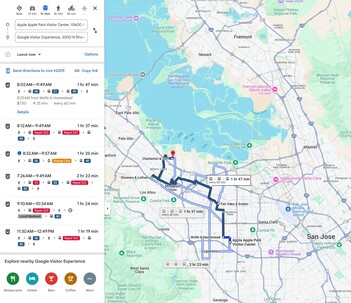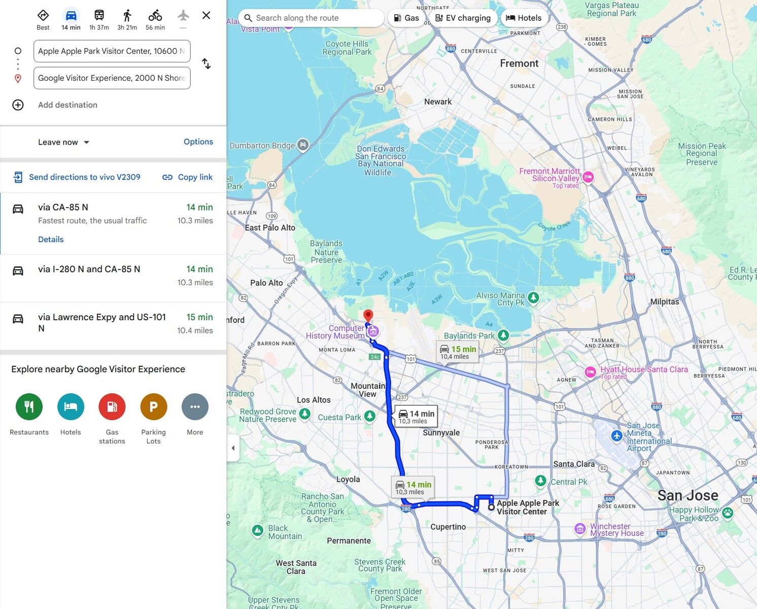 Niemniej jednak byłem zdumiony, jak silnie oryginalne koncepcje Android i iOS znajdują odzwierciedlenie w publicznym dostępie do centrów dla odwiedzających Apple i Google. Po pierwsze, uwaga na temat transportu publicznego w regionie: Cupertino i Mountain View znajdują się bardzo blisko San Jose i są oddalone od siebie o około 16 kilometrów, czyli zaledwie 15 minut jazdy samochodem. Transport publiczny zajmuje jednak co najmniej 90 minut i trzeba trochę chodzić i kilkakrotnie zmieniać autobusy, co jest stosunkowo tanie dzięki karcie Clipper, przechowywanej jako wirtualna karta w Google Wallet i Apple Wallet (dowolna liczba zmian jest dozwolona w ciągu 2 godzin).